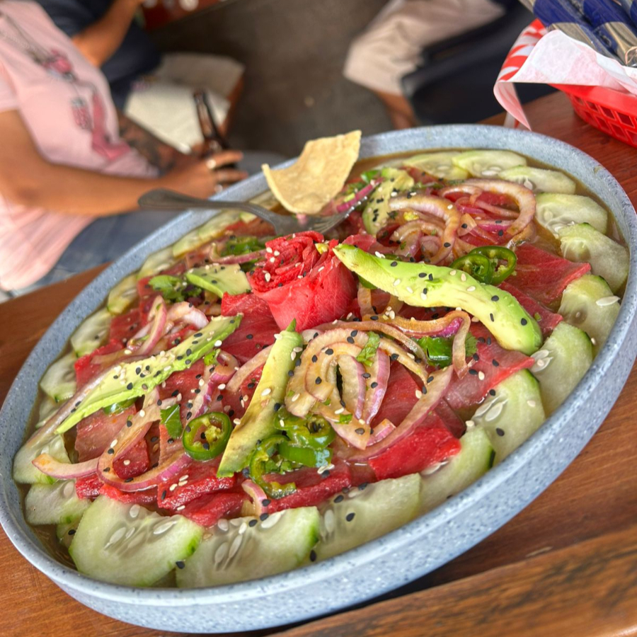 PESCADO FRESCO, CEBOLLA MORADA, HABANERO, LIMON, PEPINO, SAL DE GRANO