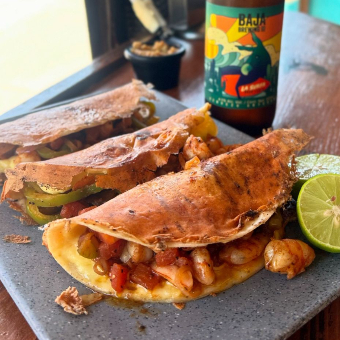 TORTILLA DE MAIZ CON COSTRA DE QUESO RELLENOS DE GUISO DE CAMARON, CEBOLLA Y PIMIENTO