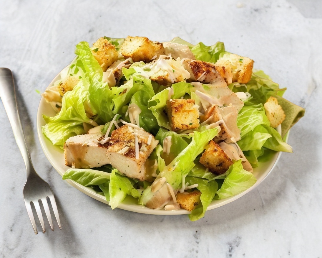 Lechuga, queso parmesano, crotones, 200 g de pechuga a la plancha y aderezo césar.