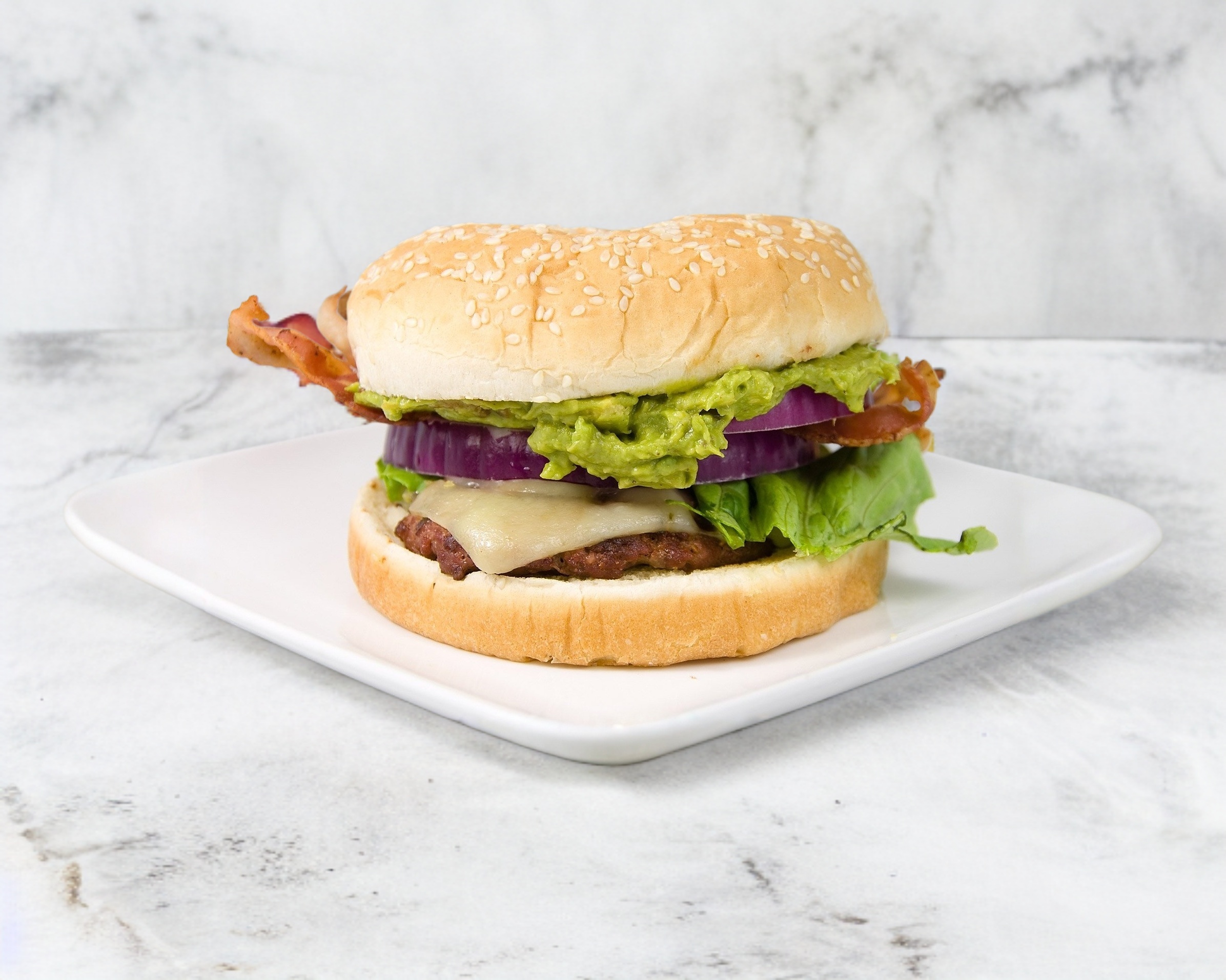 250 g De carne de res, queso americano, queso mozarella, pan brioche, lechuga, cebolla, tomate y aguacate.