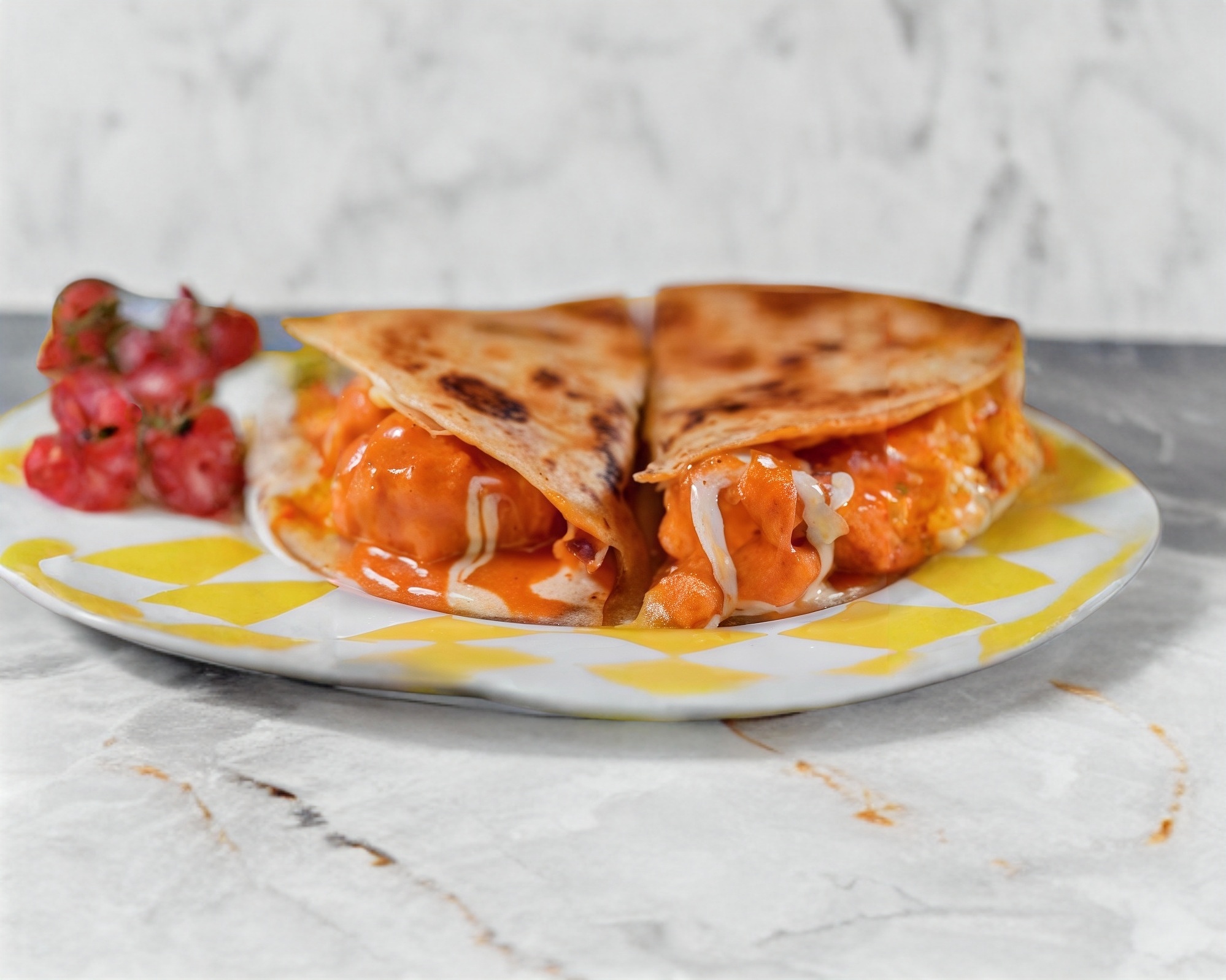 Súper quesadilla rellena de 200 g de boneless en salsa búfalo, acompañada de aderezo ranch, mexicana y guacamole.