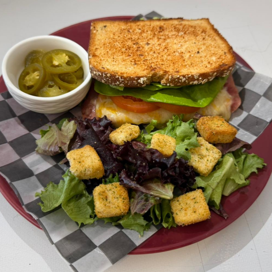 preparado 3 quesos con crema de chopotle, lechuga italiana, y jamon de la casa acompañado de frituras de vegetales
