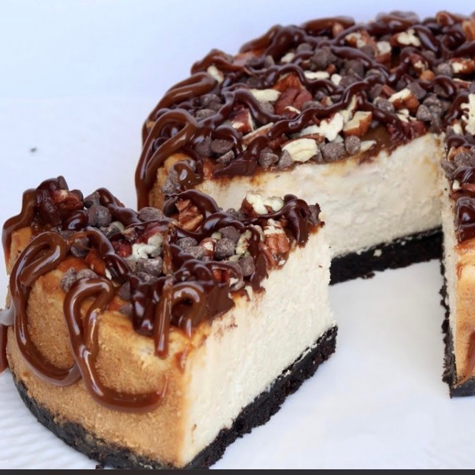 Rico pay de queso philadelphia, con trozos de chocolate amargo y cajeta