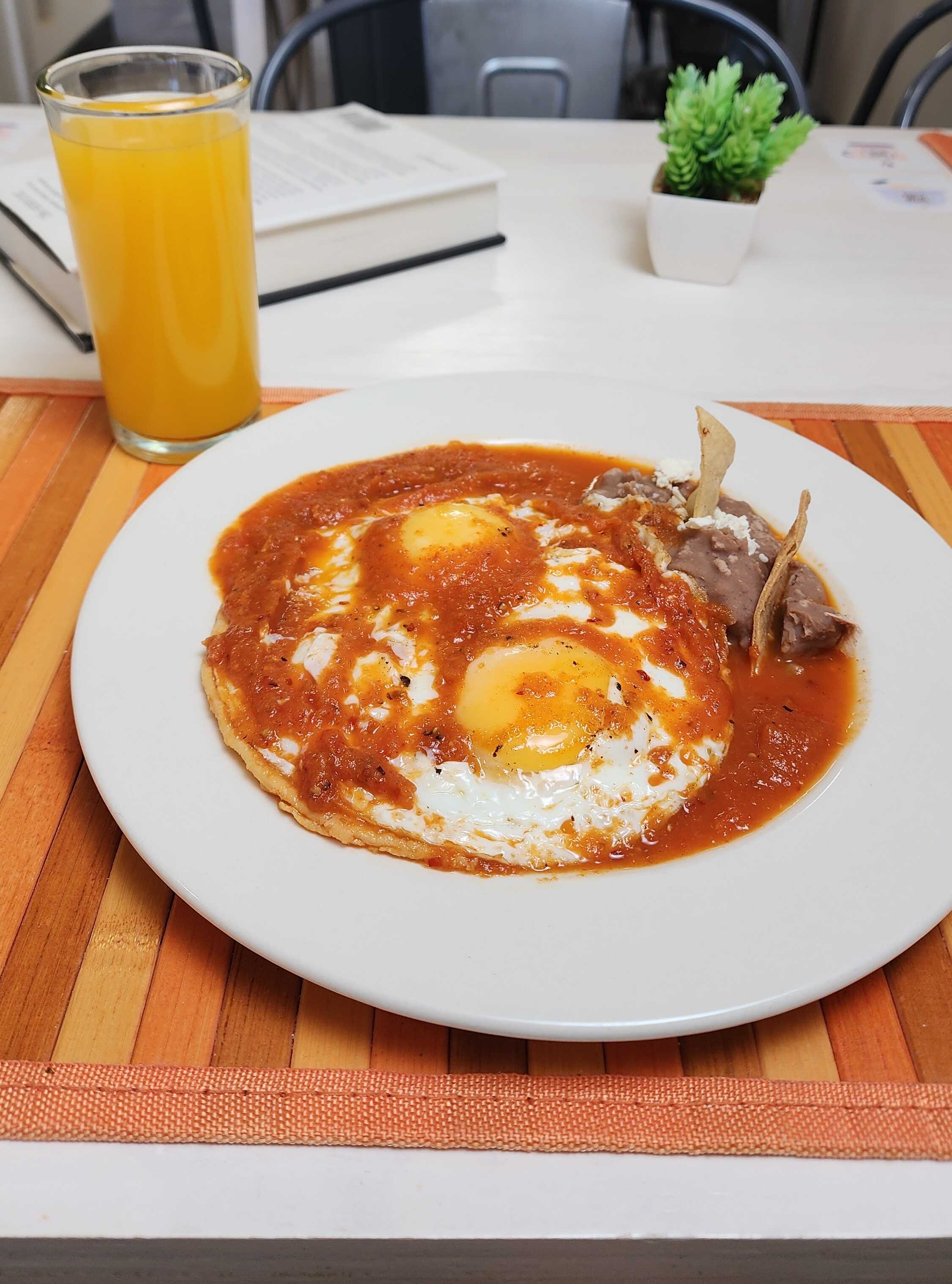 Huevos estrellados sobre tortillas, cubiertos con salsa, acompañados de frijoles.