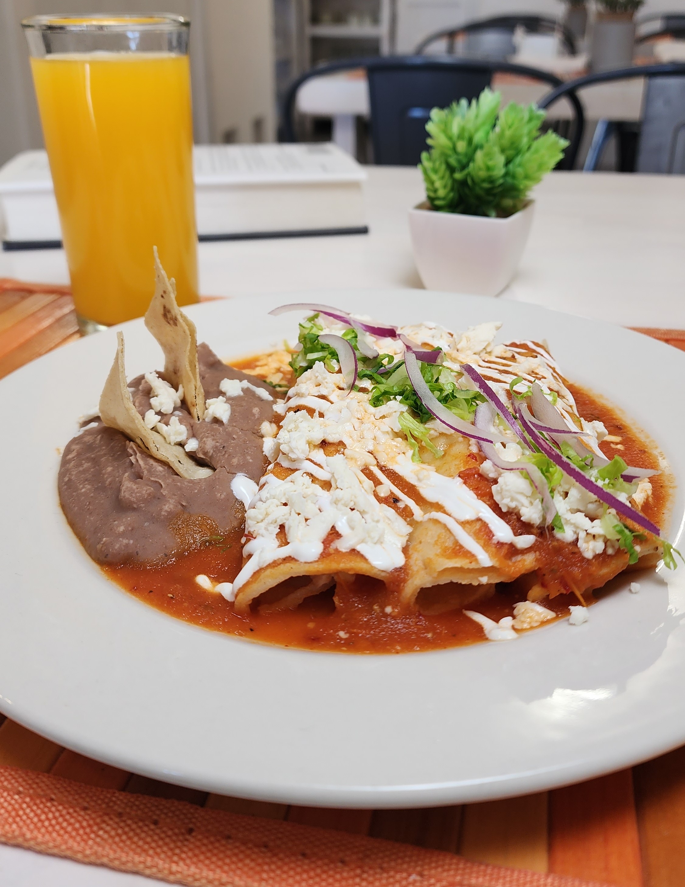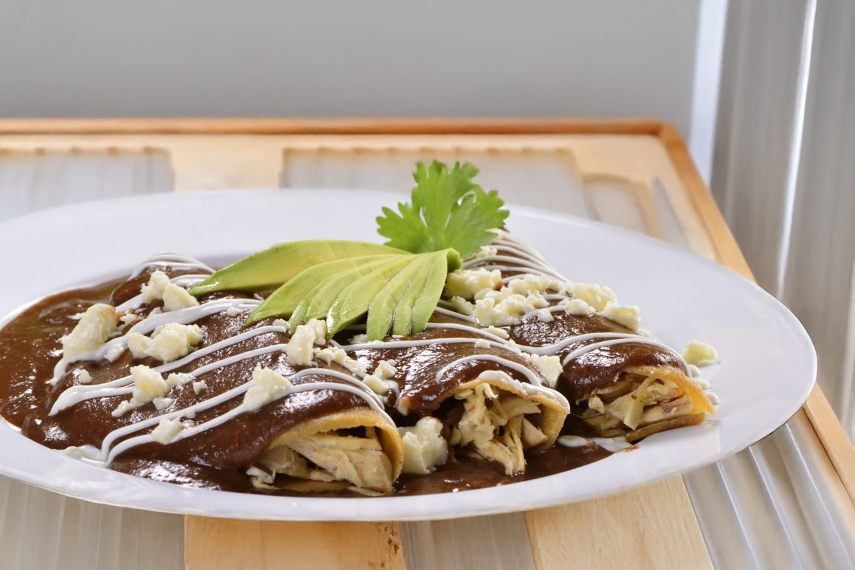 Enchiladas rellenas de pollo bañadas en salsa verde o roja, acompañadas de frijoles.