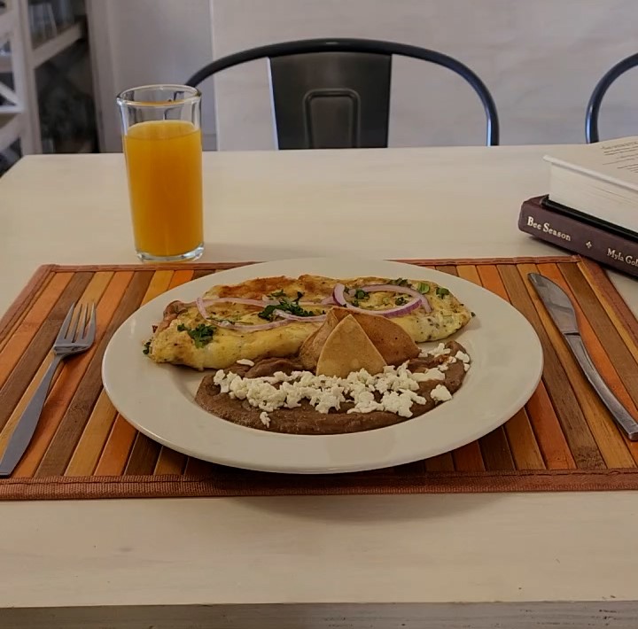 Omelette suave con opción de queso o vegetales frescos, acompañado de frijoles.