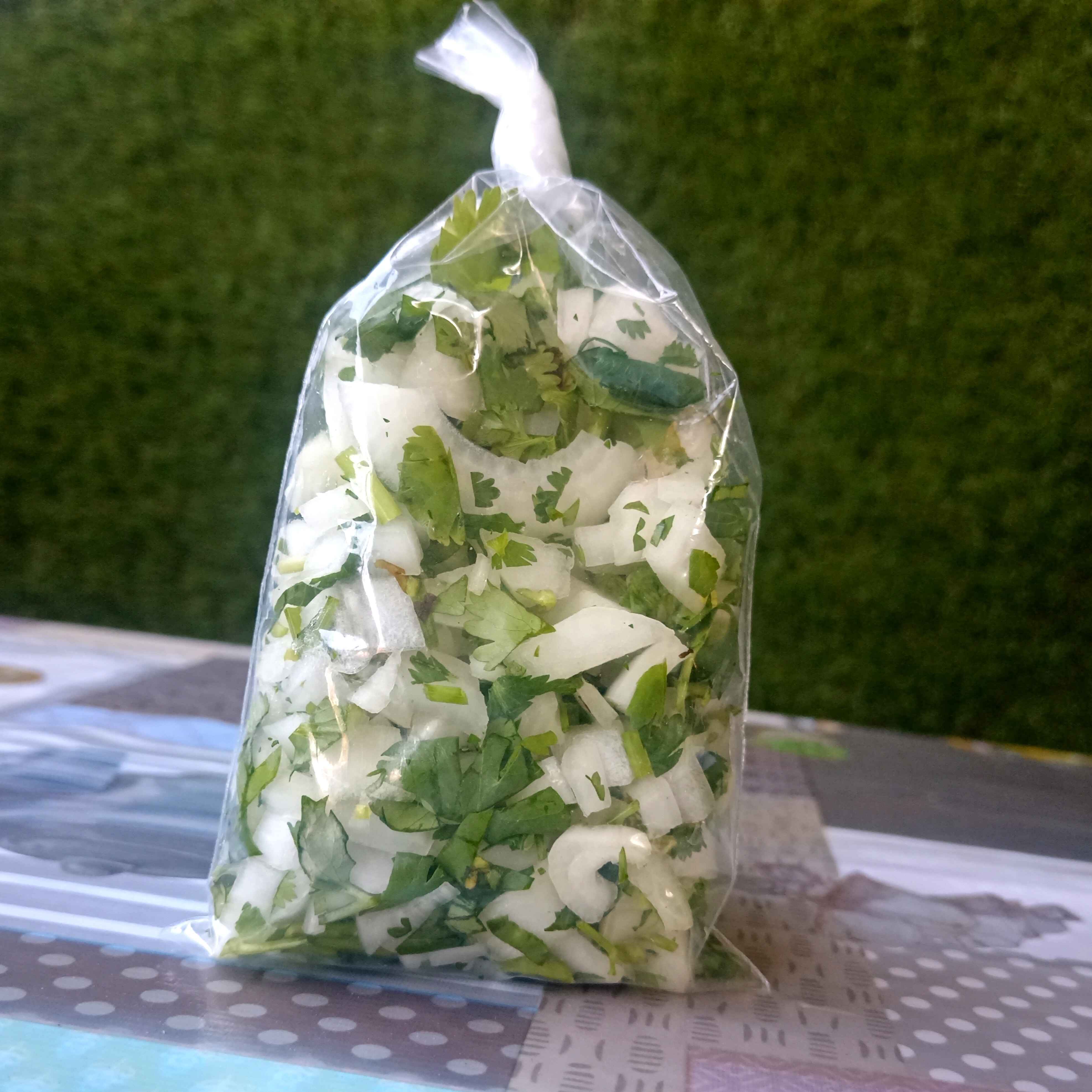 Ensalada de zanahoria, salsa roja, salsa verde, 150 gramos de tortilla de maíz, limones, cebolla y cilantro.