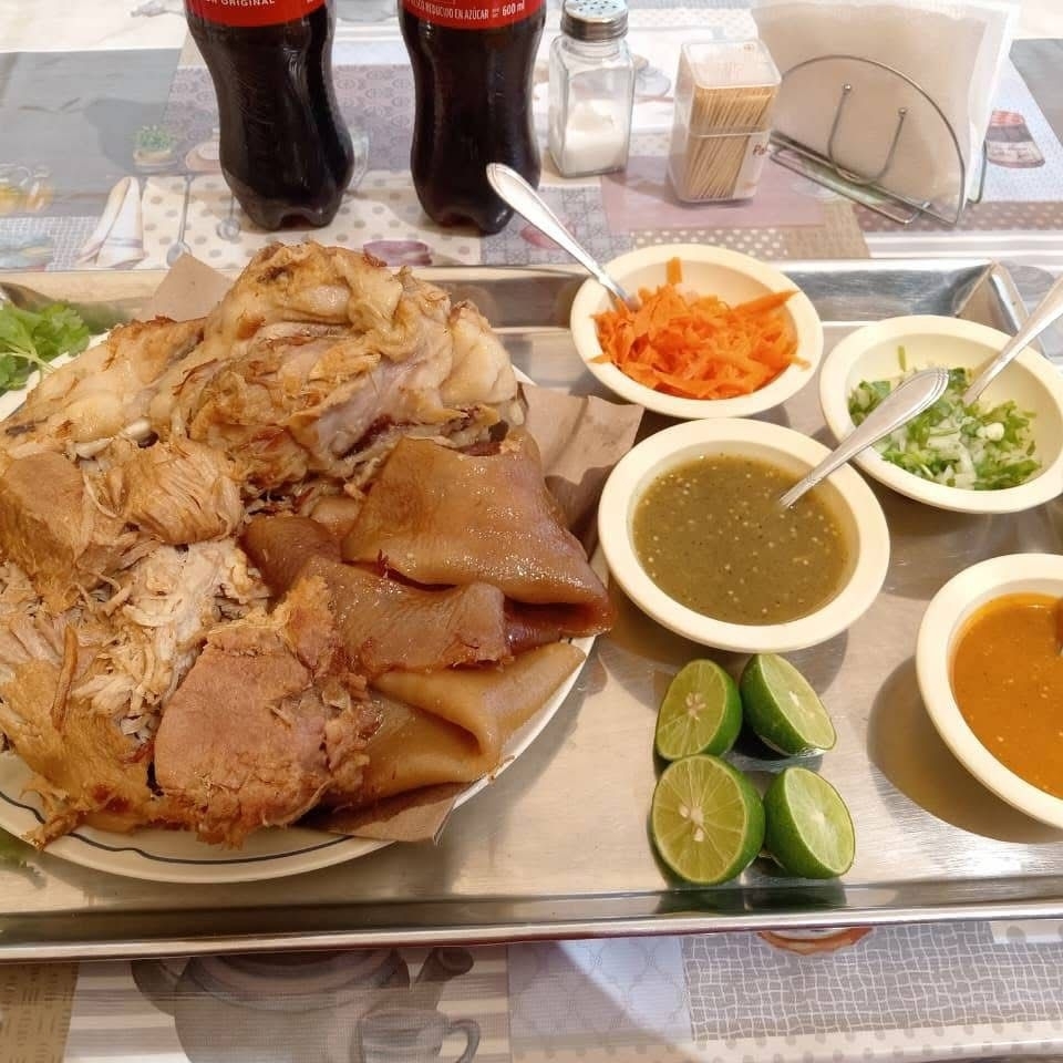 1/2 Kg de Carnitas acompañada de ensalada de zanahoria, salsa roja, salsa verde, 250 gramos de tortilla de maíz, limones, cebolla y cilantro. (Porción personal)