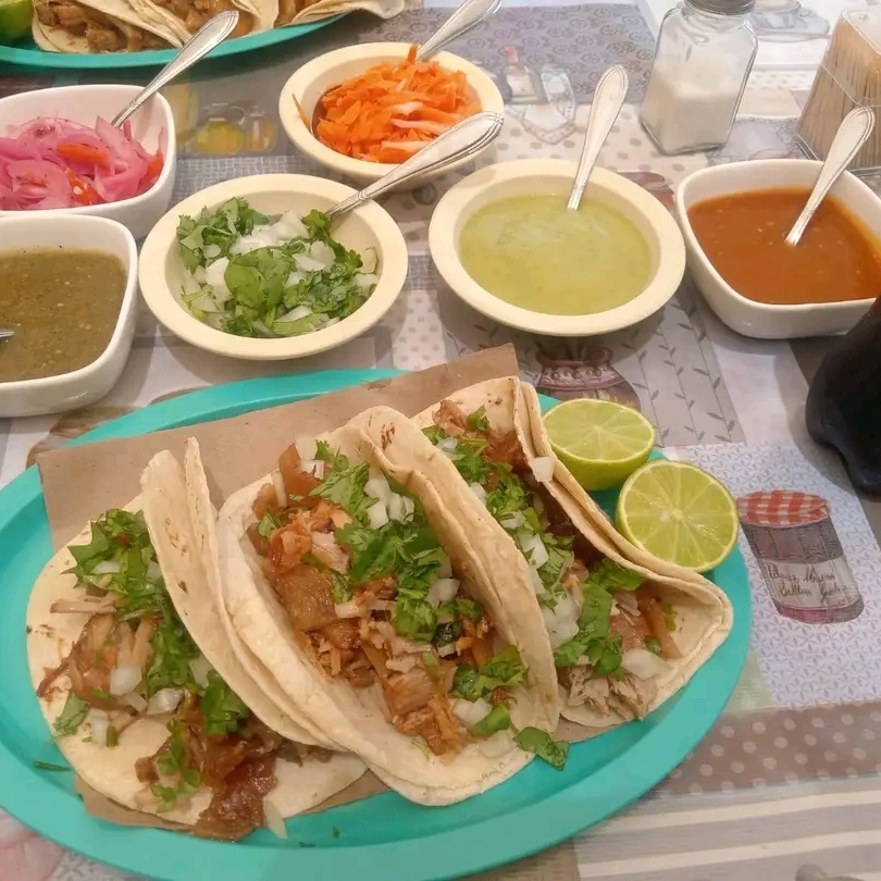 Ensalada de zanahoria, salsa roja, salsa verde, 450 gramos de tortilla de maíz, limones, cebolla y cilantro.