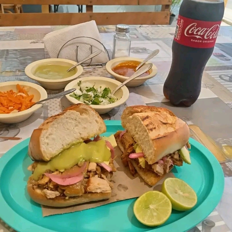 Pan bolillo con surtido, dorada con manteca de puerco con aguacate, cebolla curtido y salsa verde o roja. Acompañada de ensalada de zanahoria, limon, cebolla y cilantro.