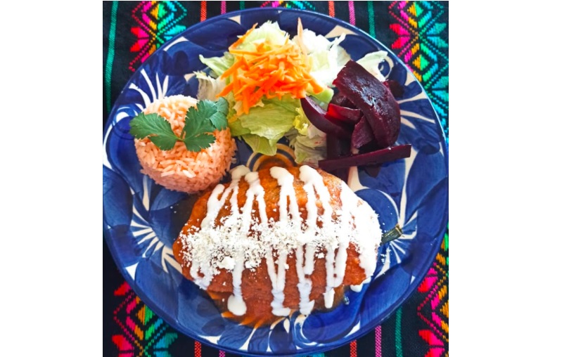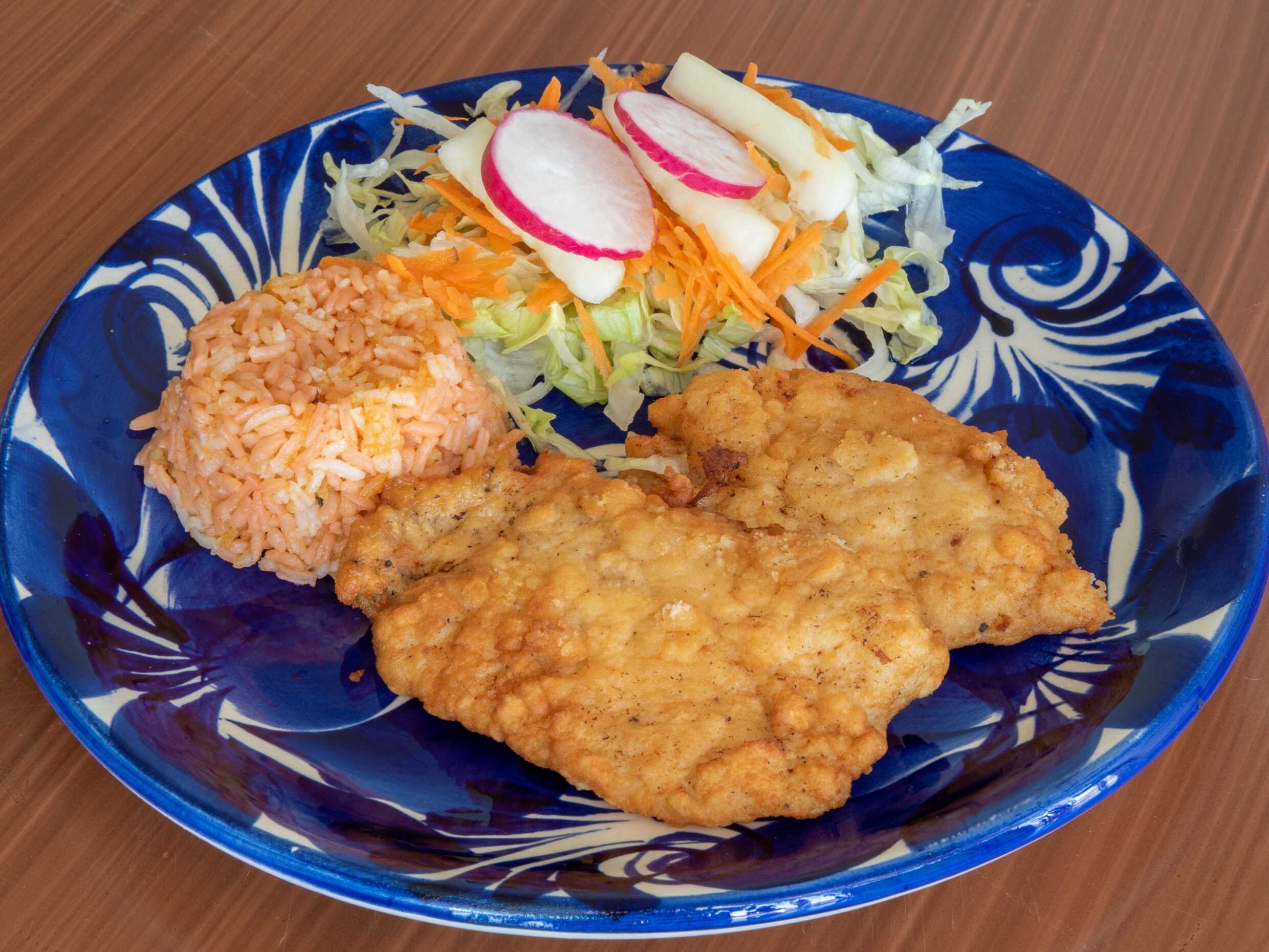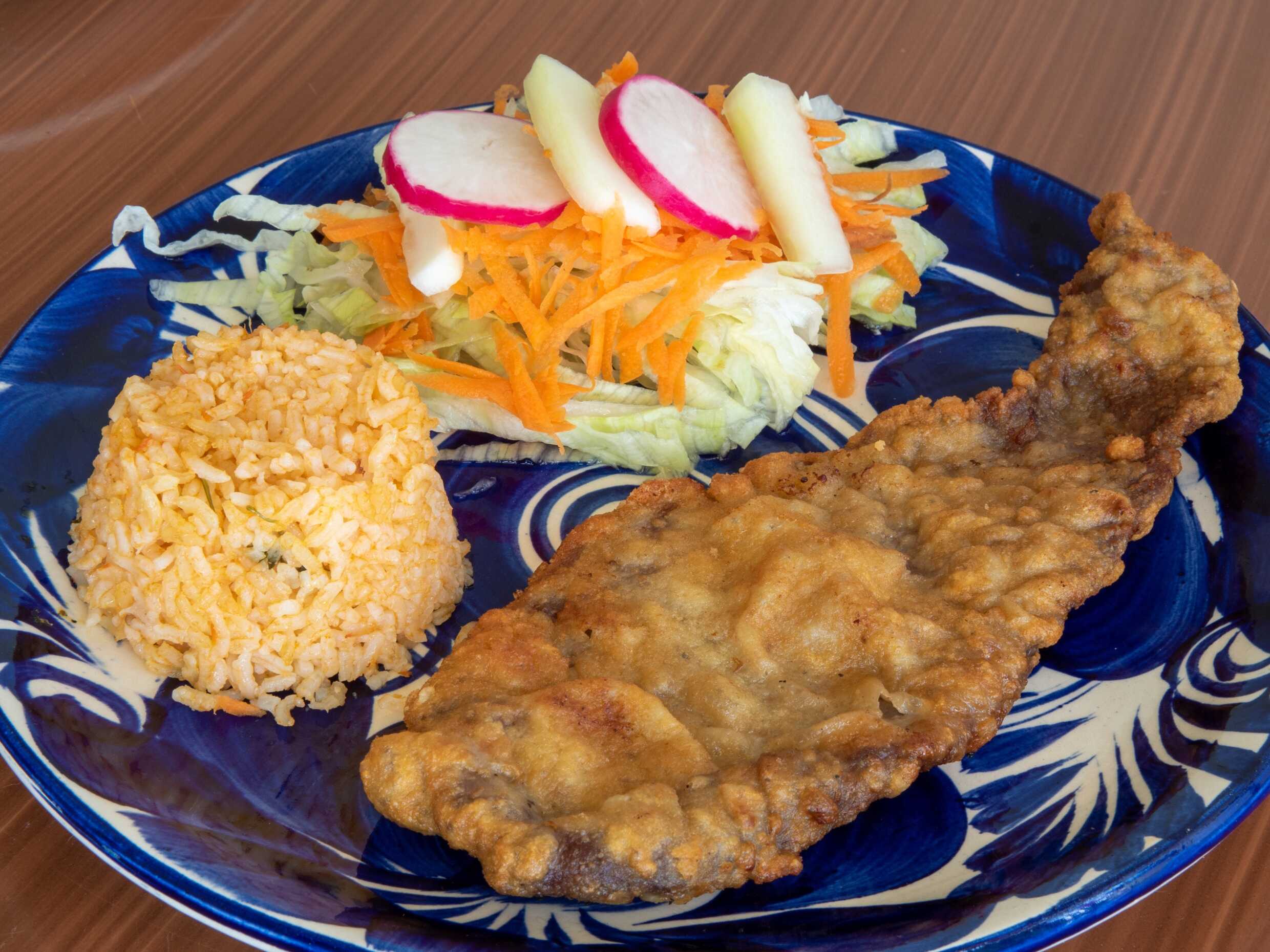 Acompañada de arroz y ensalada, tortillas y salsa picosa.