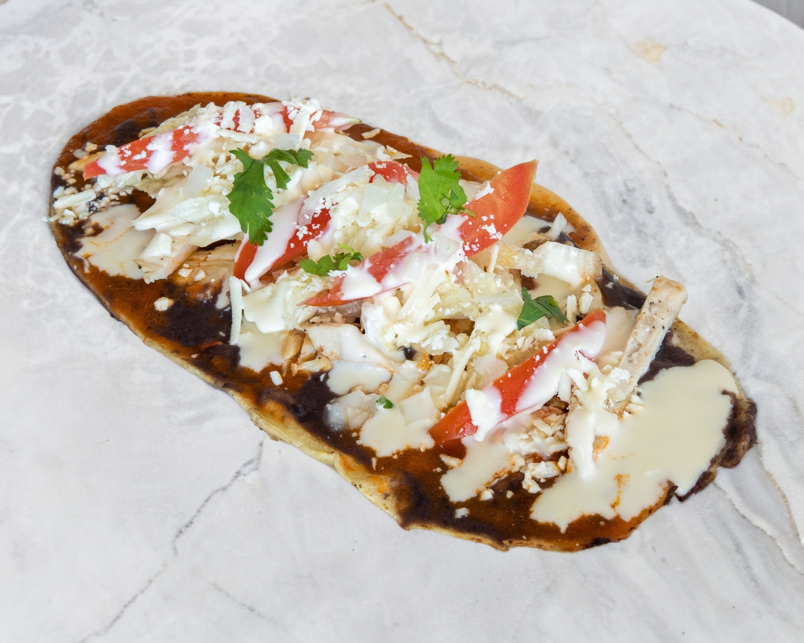 1 pieza de huarache de maíz, frijoles, salsa roja, tinga de pollo, lechuga, tomate, crema y queso Cotija.