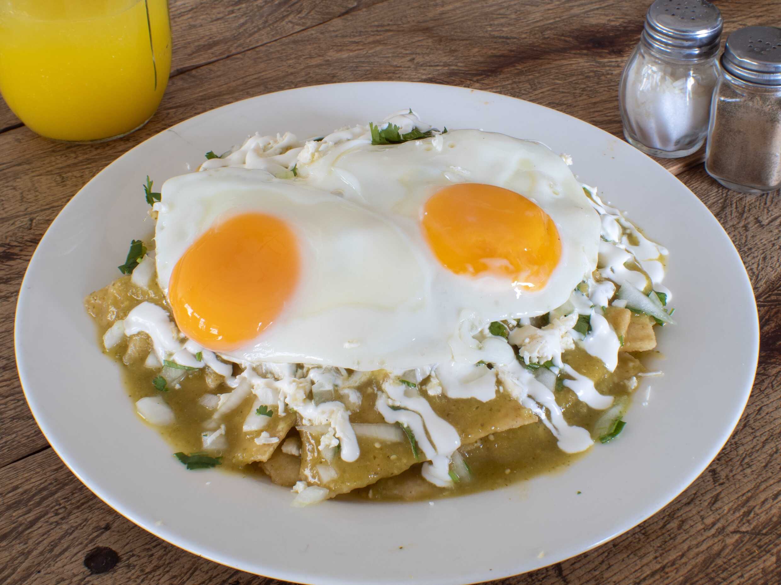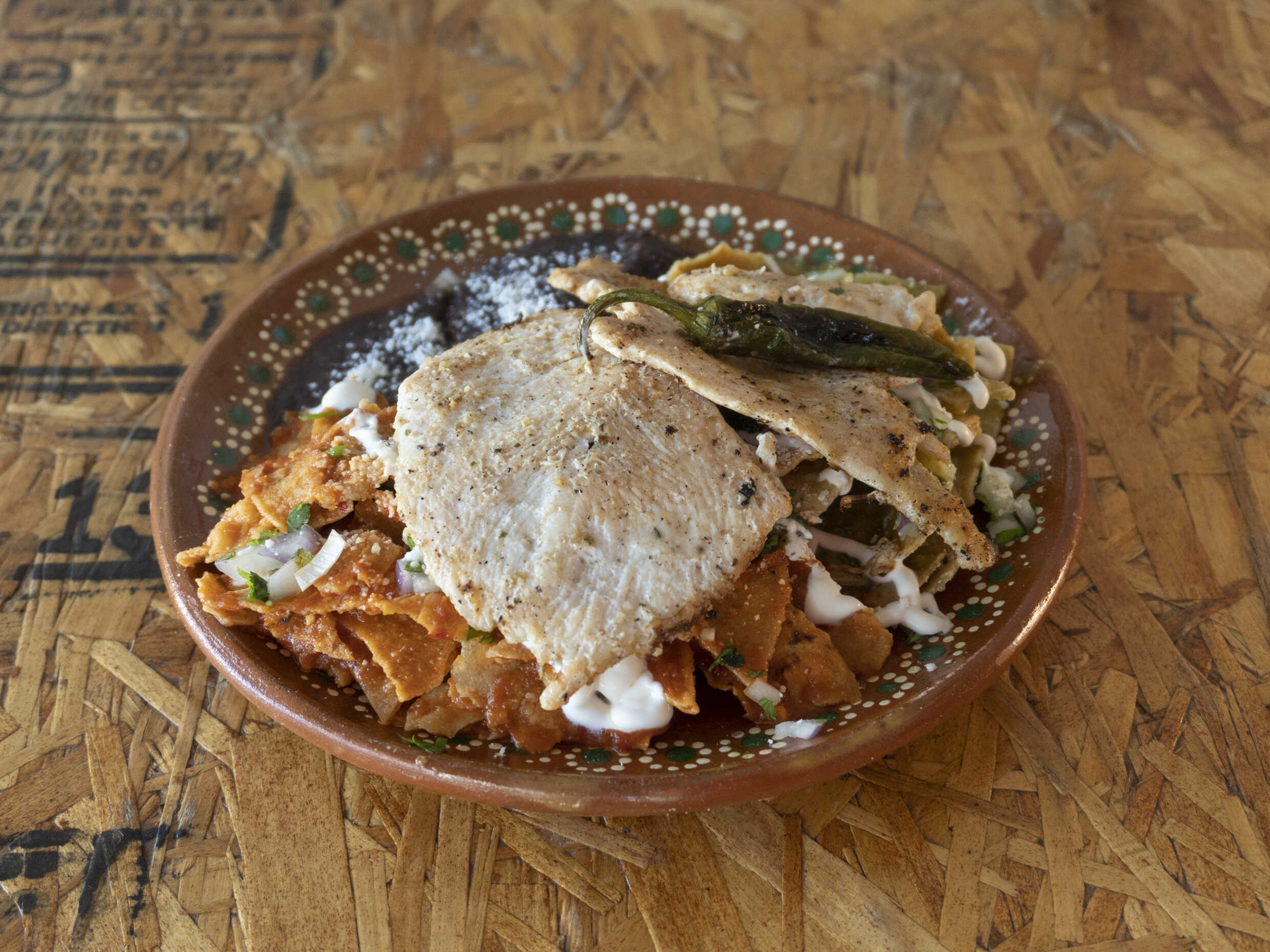 Deliciosos chilaquiles con totopos, pollo queso, crema y la salsa de tu elección.