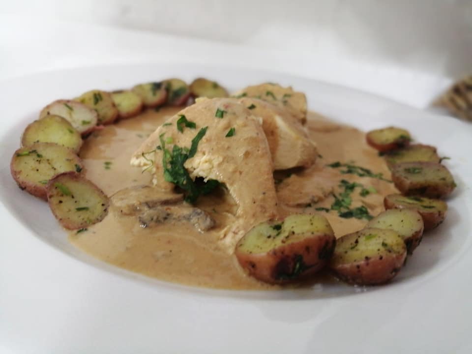 Pierna y muslo bañado con nuestra salsa de chipotle y champiñones, sopa y guarniciones.