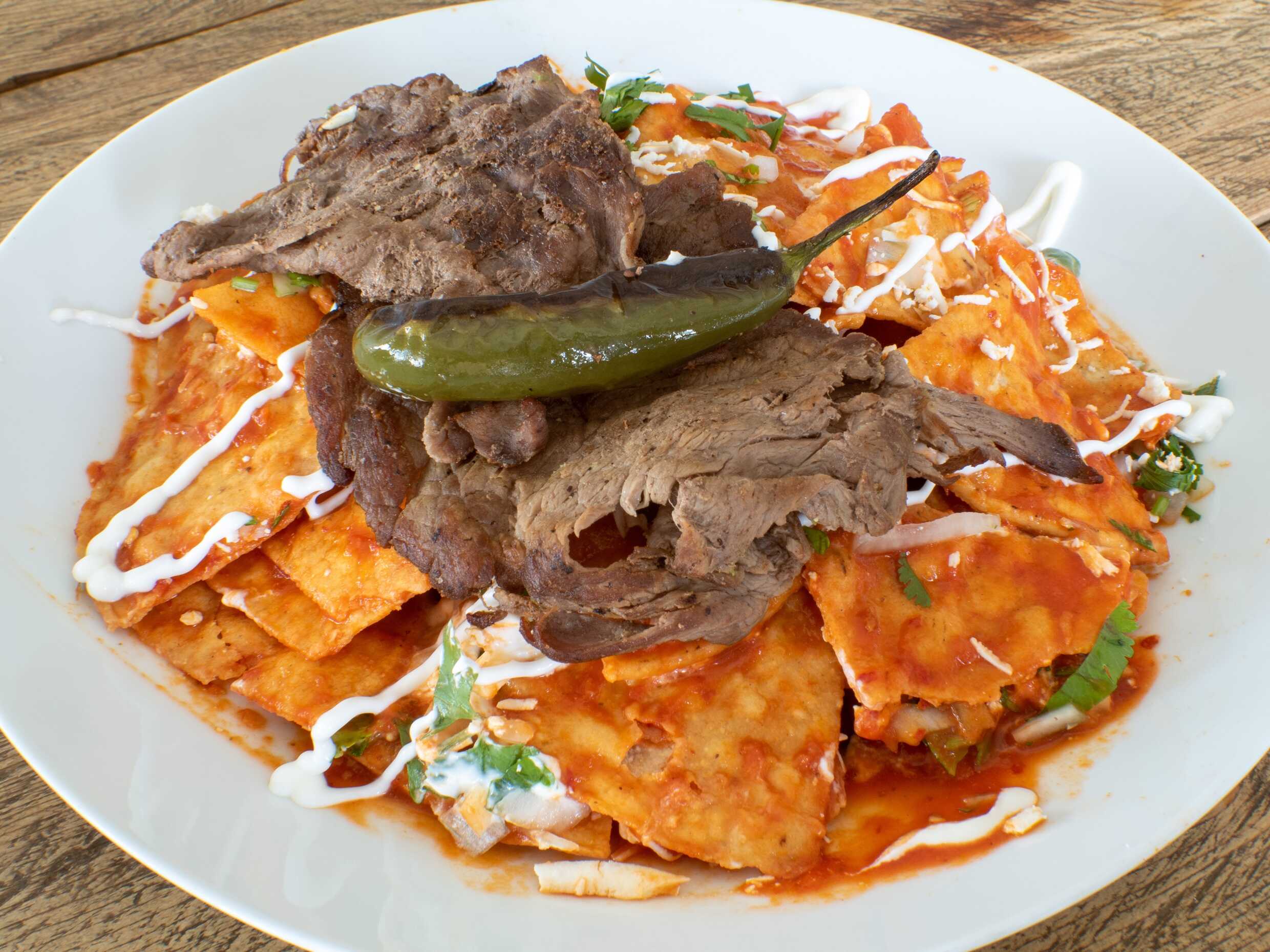 Chilaquiles con totopos bañados en salsa a elección con carne asada (para una persona).