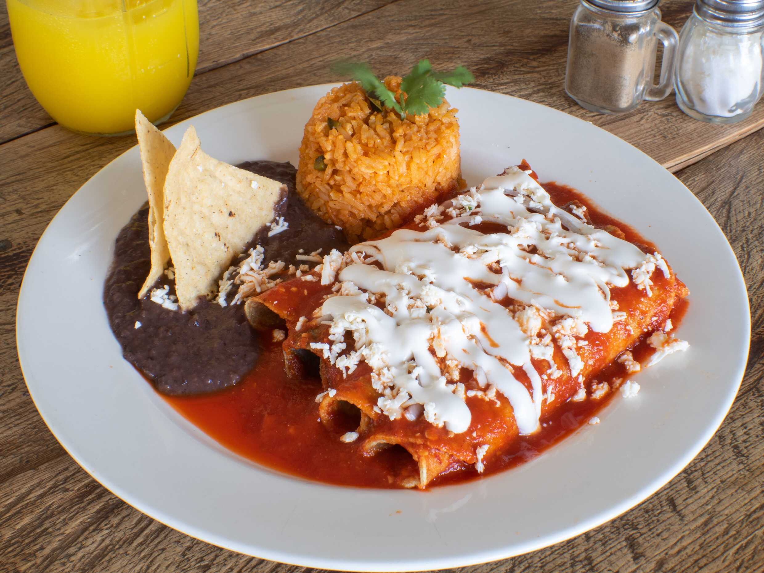 Enchiladas verdes o rojas enmoladas c/pollo o panela, enchiladas suizas, enchiladas chilangas, enchiladas potosinas, trio de sopes, trio de quesadillas, acompañado con frijoles más chilaquiles.