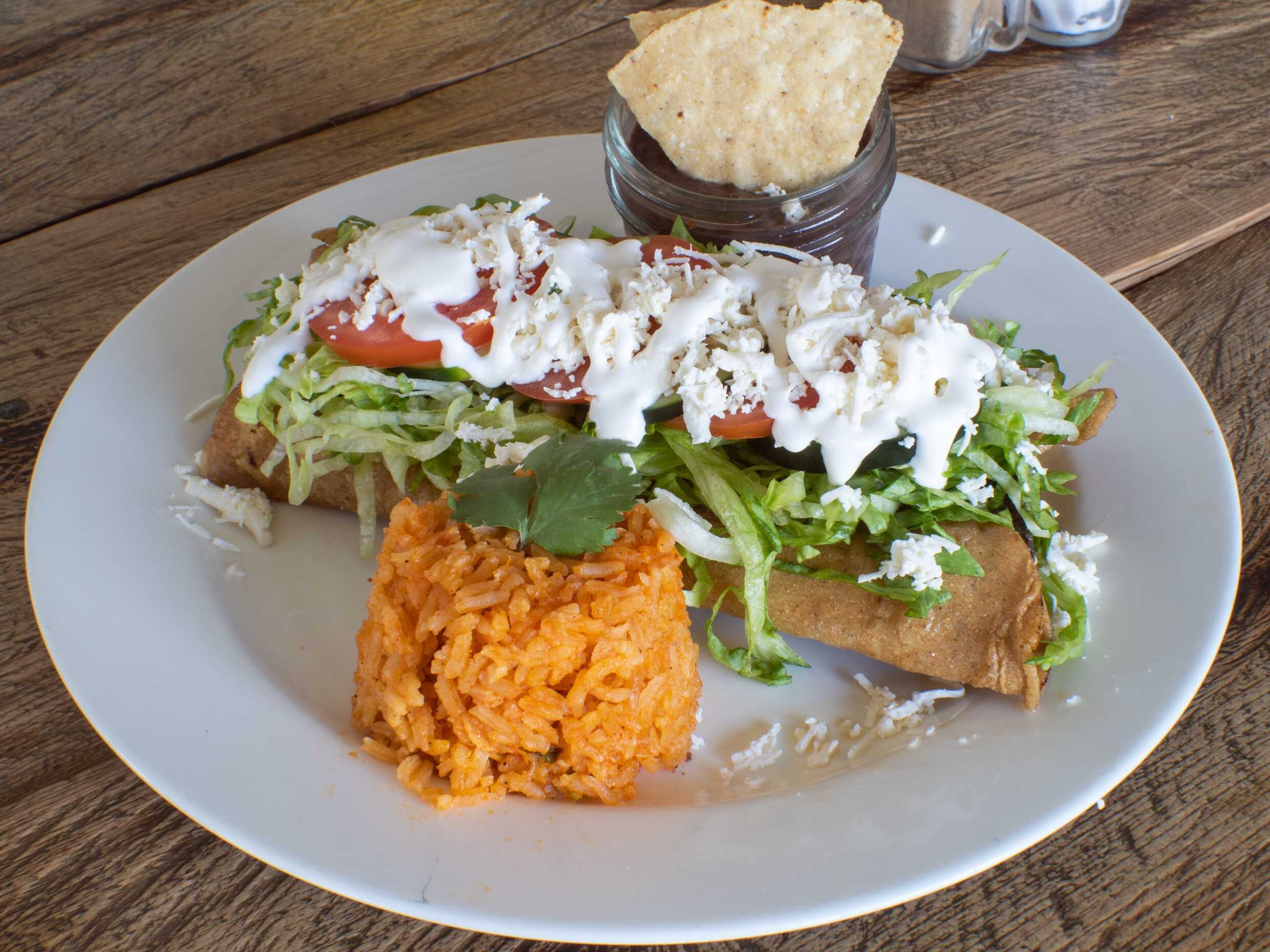 4 Piezas rellenas de pollo bañadas con frijoles refritos y coronadas con chorizo, queso y crema.