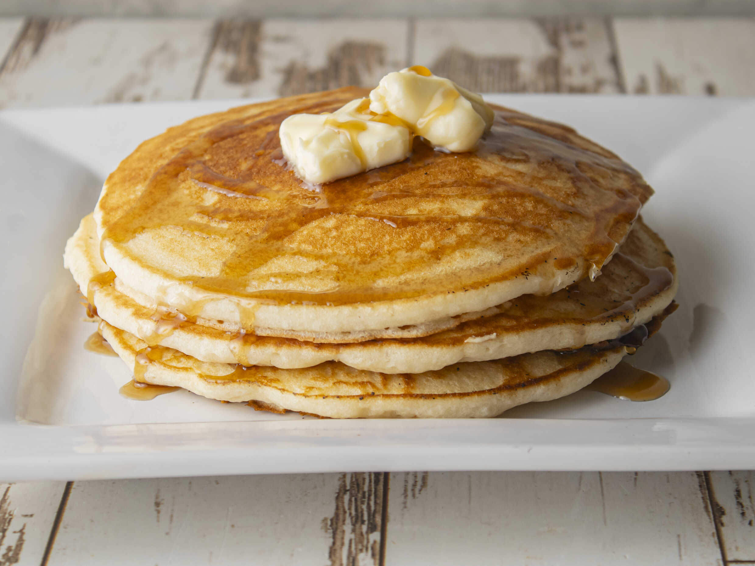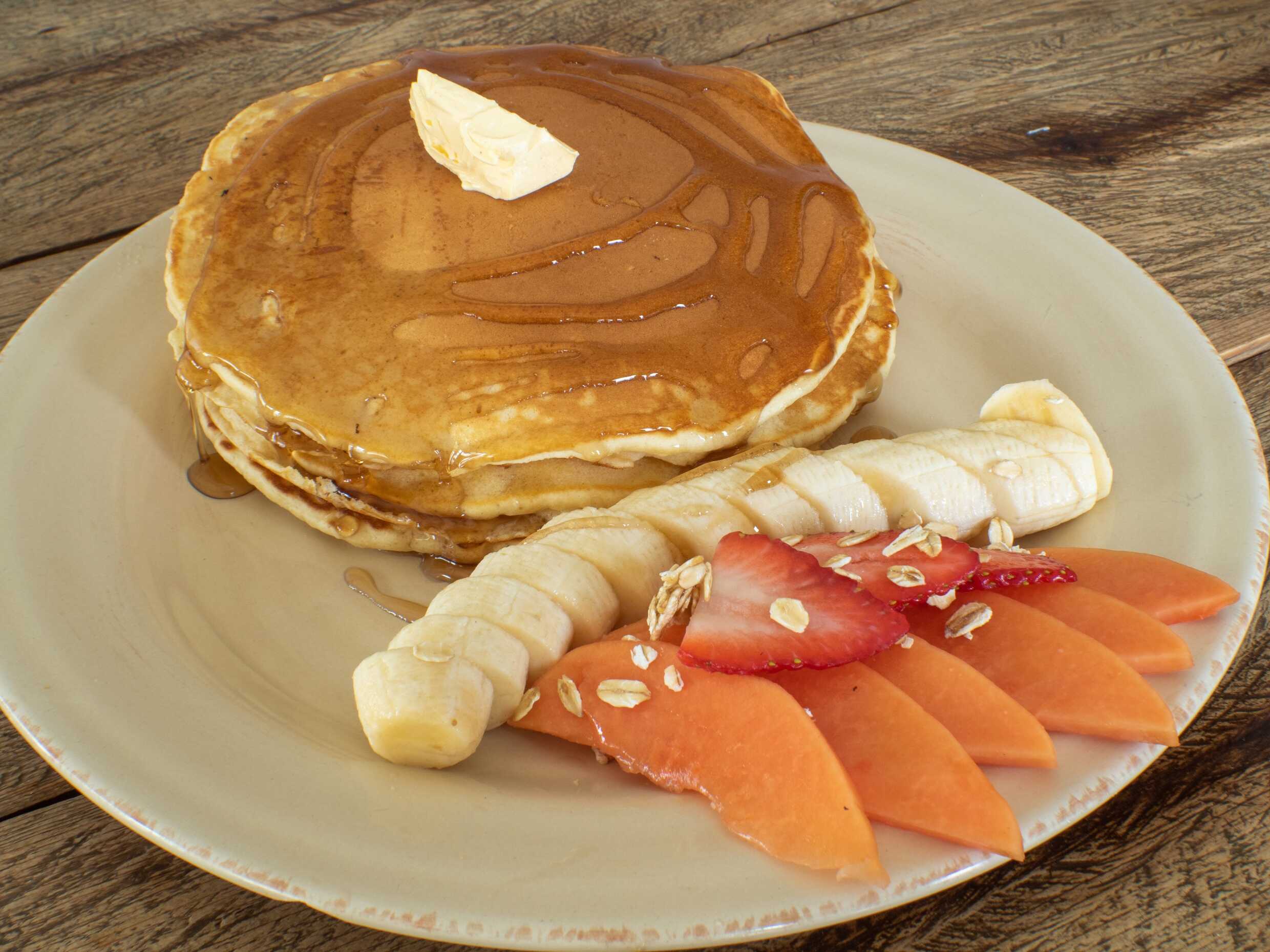 3 Piezas de hotcakes, acompañados de miel maple, mantequilla y mermelada de la casa.