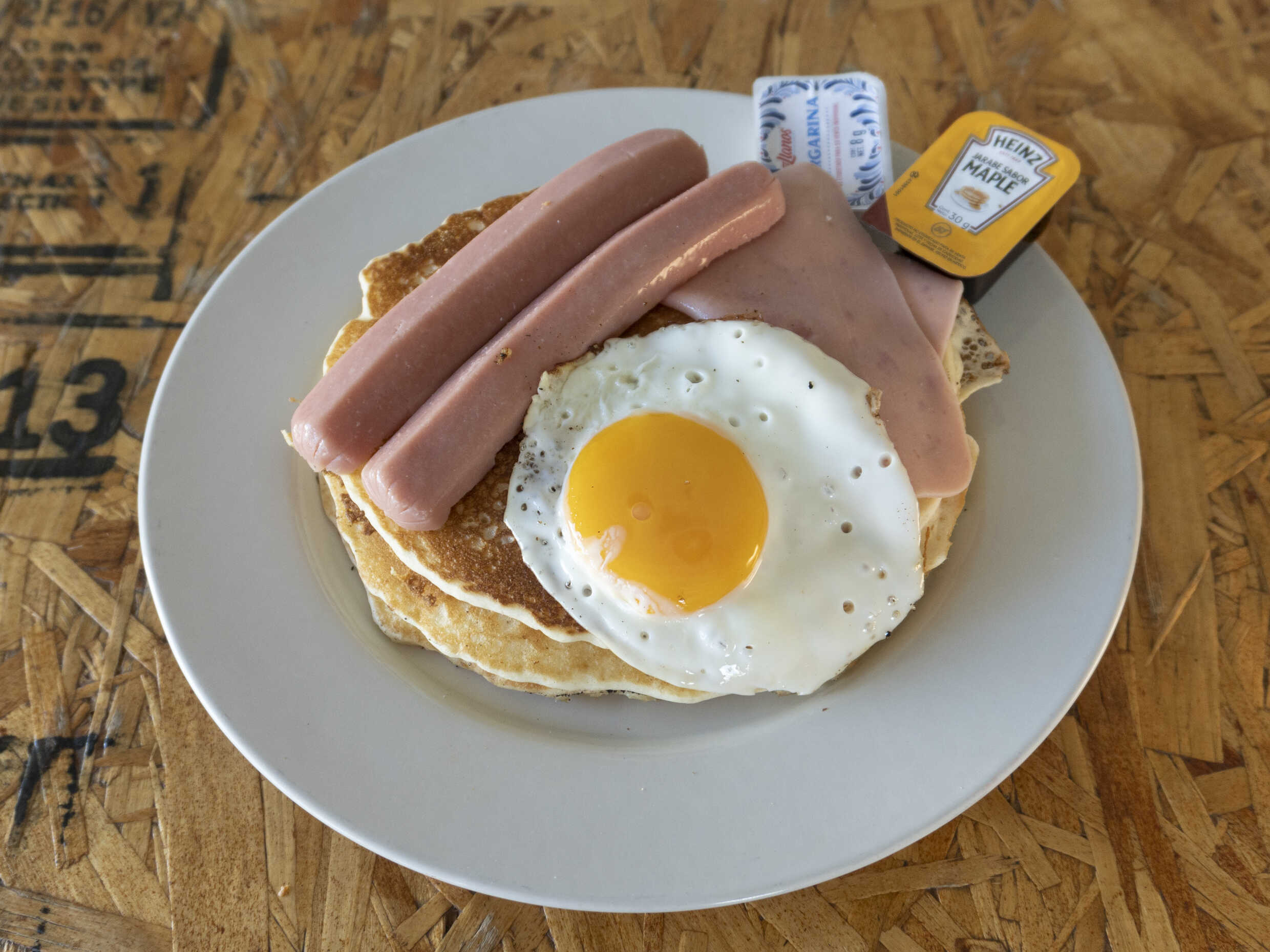 3 Piezas de hot cakes, dos piezas de huevo, más tocino doradito, miel maple y mantequilla.