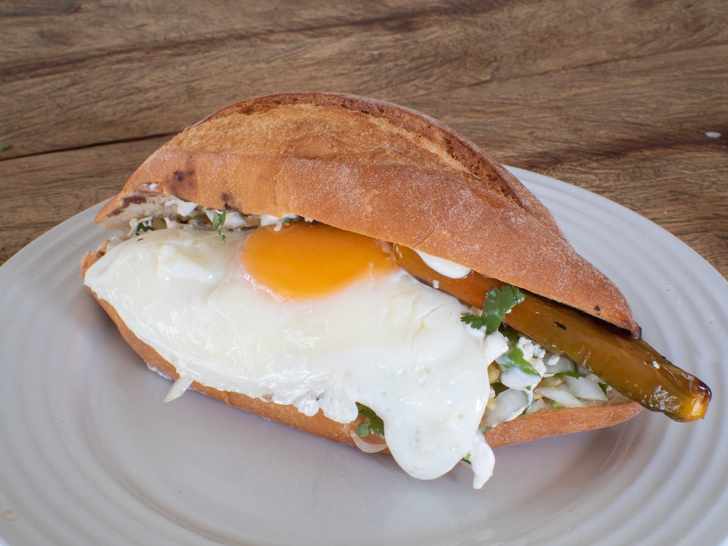 Bolillo crujiente, chilaquiles, vegetales y queso fresco, salsa a tu elección.