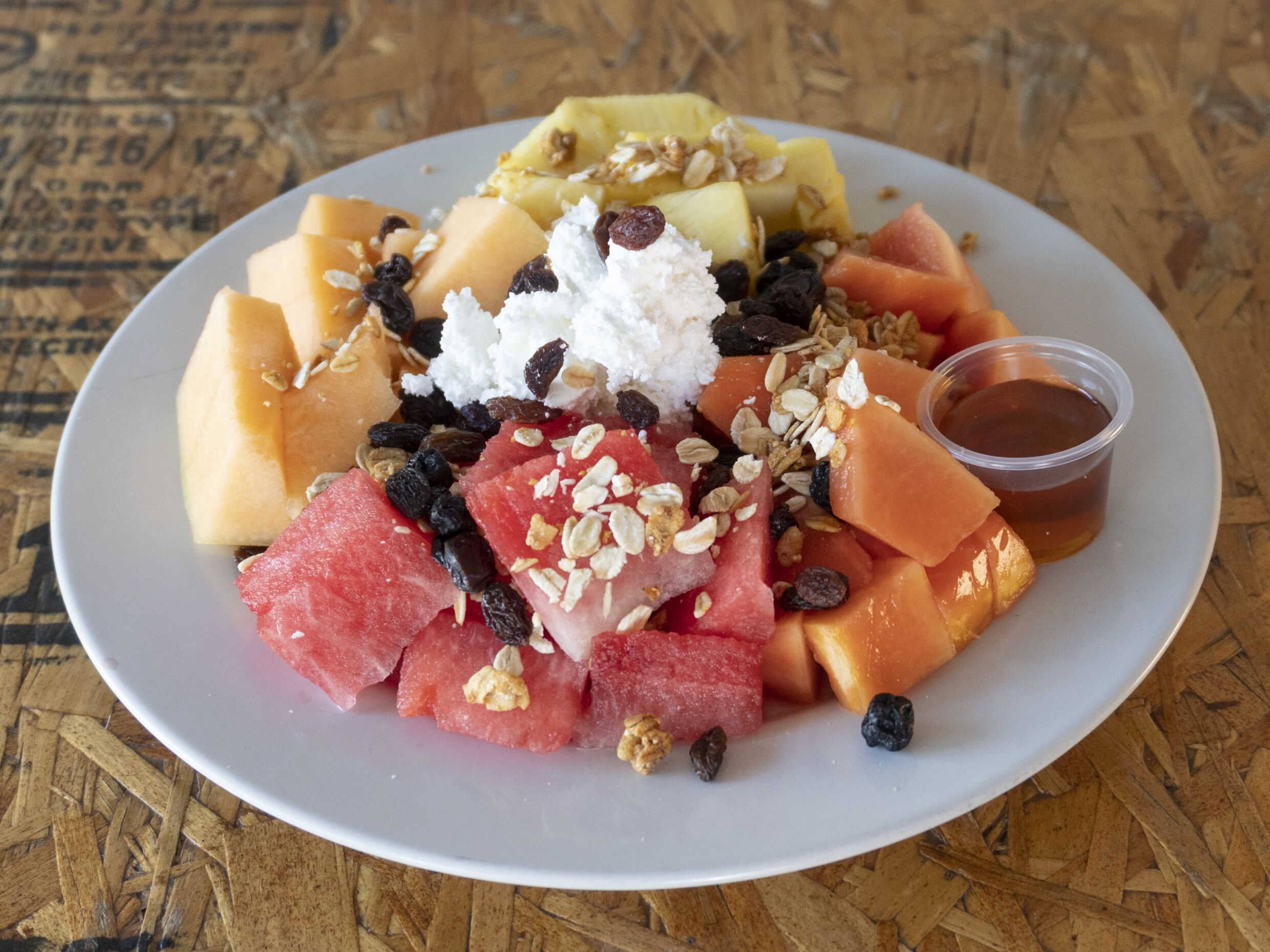 3 Piezas, más fruta de temporada, miel y mantequilla.