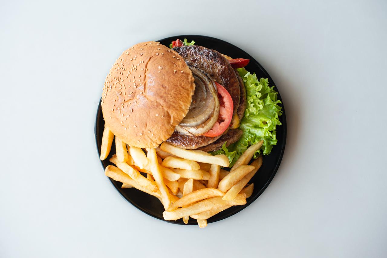 6 oz de carne/ Lechuga / Tomate/ Cebolla / Queso americano *Incluye papas fritas