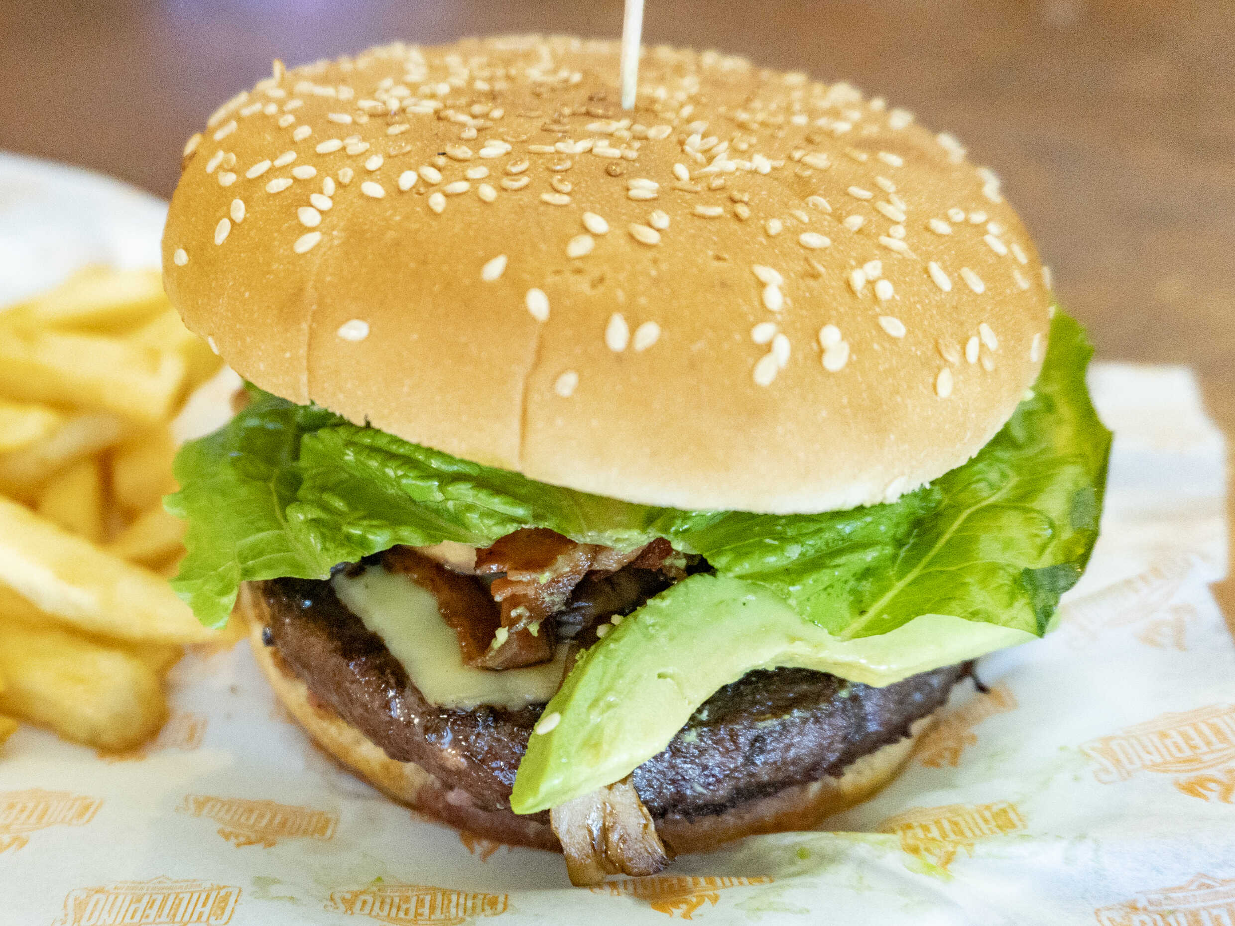 Carne de res (200gr) con queso manchego, champiñones, tocino, tomate, lechuga, aguacate y acompañamiento a elegir.
