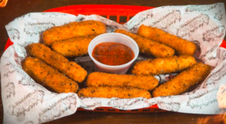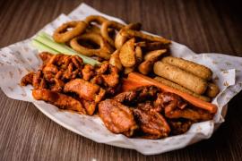 Sampler con alitas (400gr), boneless (125gr) con salsas de su elección, y media orden de papas sazonadas, 6 aros de cebolla, 4 dedos de queso, zanahoria y apio