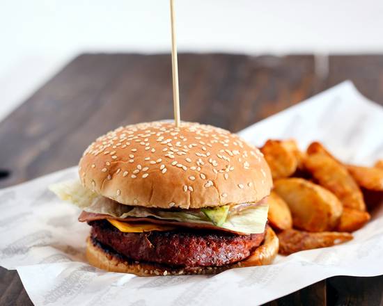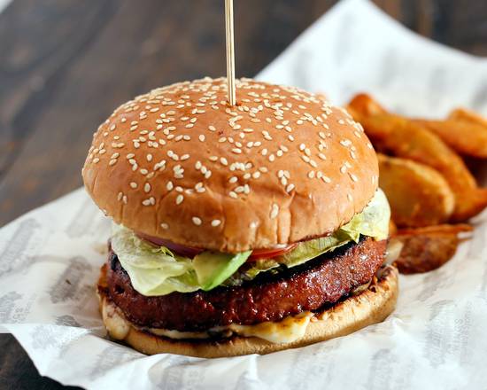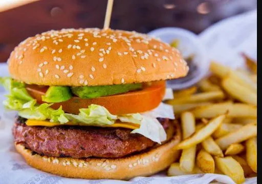 Carne de res (200gr) con queso amarillo, tomate, lechuga, aguacate y acompañamiento a elegir.