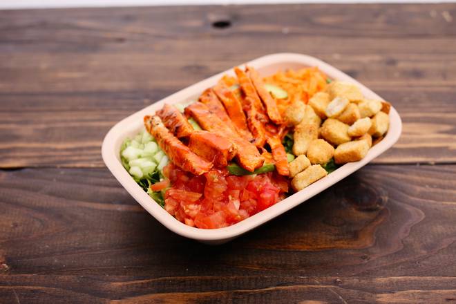 Cama de lechuga fresca, tomate, aguacate, pepino, zanahoria, crutones y tiras de pollo (170 gramos) empanizadas bañadas en salsa de su elección.