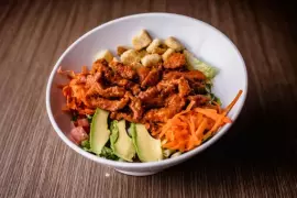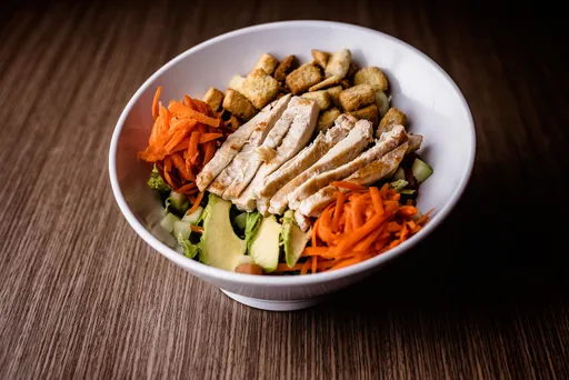 Cama de lechuga fresca, tomate, aguacate, pepino, zanahoria, crutones y tiras de pollo a la plancha (170 gramos), bañadas en salsa de su elección.