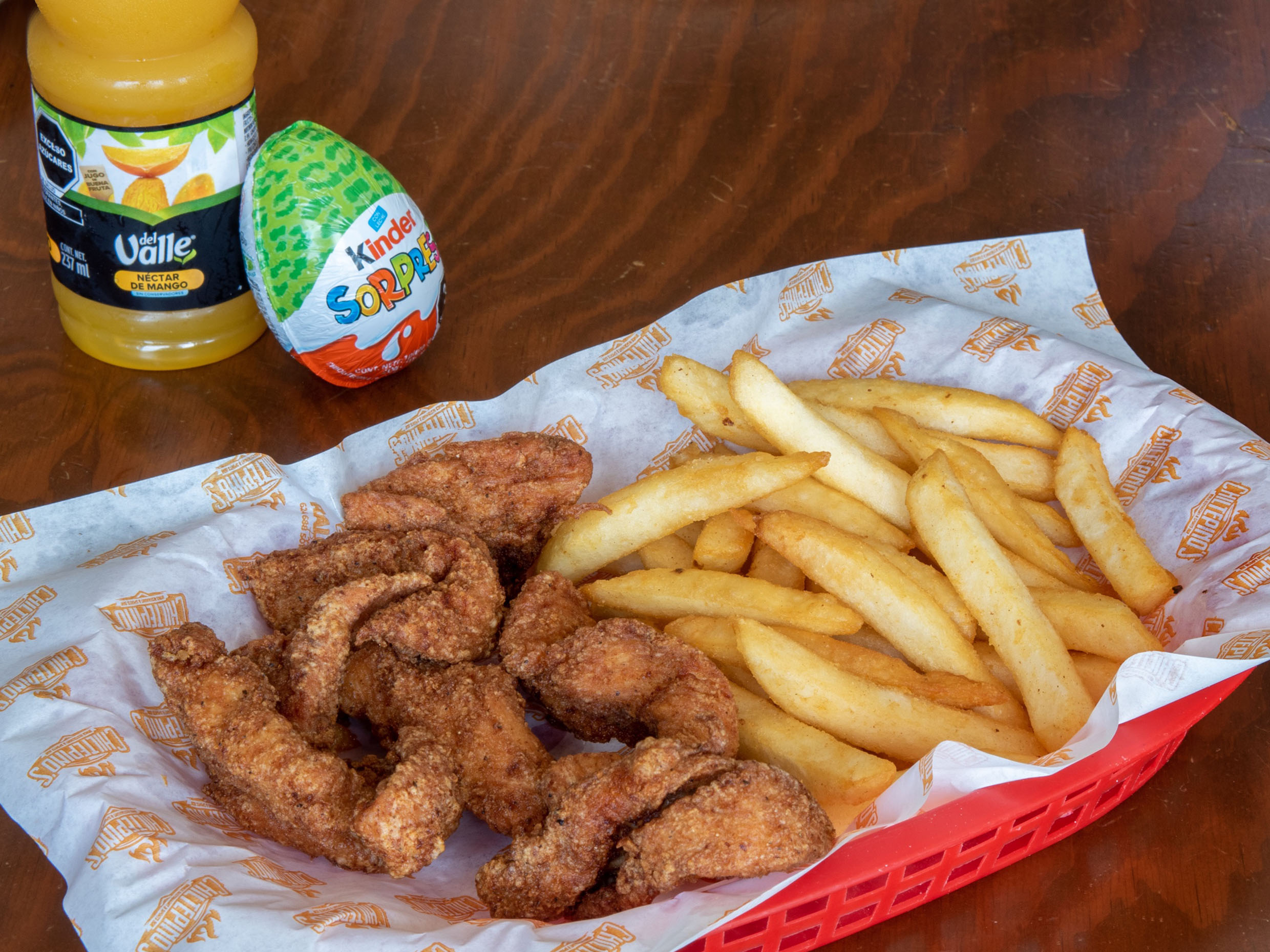 Deliciosa pechuga de pollo en tiras empanizada y fritas(250 gr) bañadas en salsa de su elección, acompañados de zanahoria y apio.