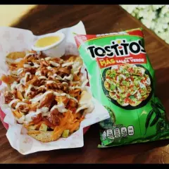 Tostitos, con boneless (125gr) bañados en salsa mediana, con pepino, tomate, zanahoria, queso cheddar y aderezo chiltepino's. Los ingredientes se envían por separado.