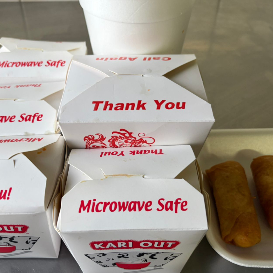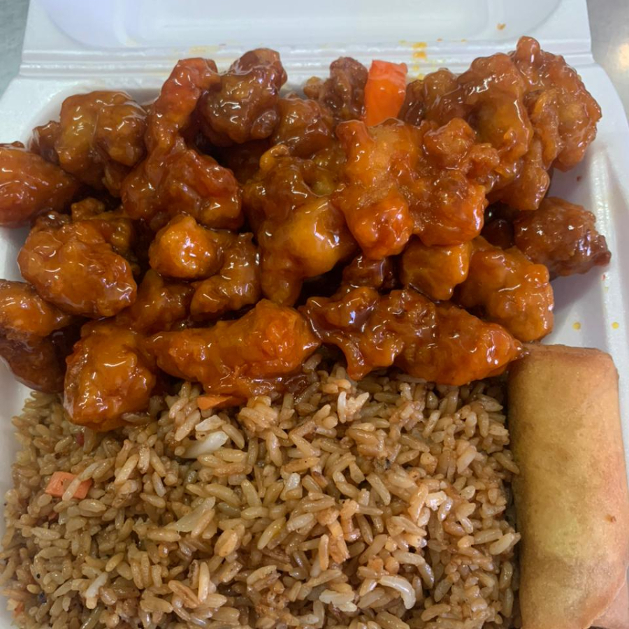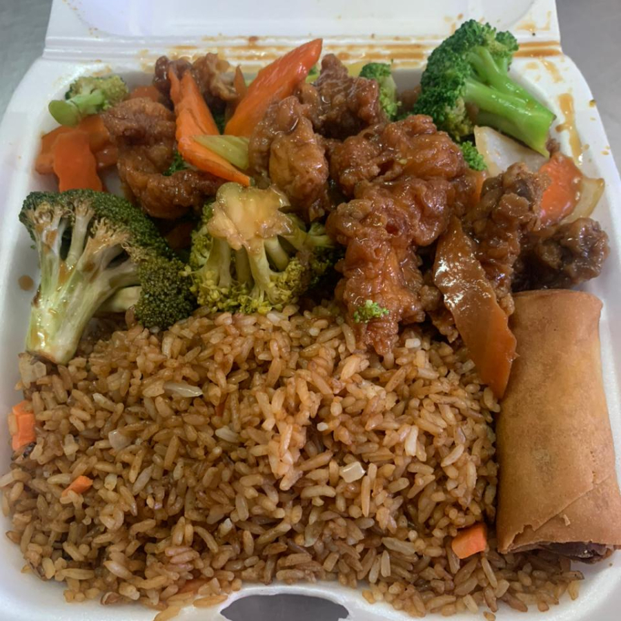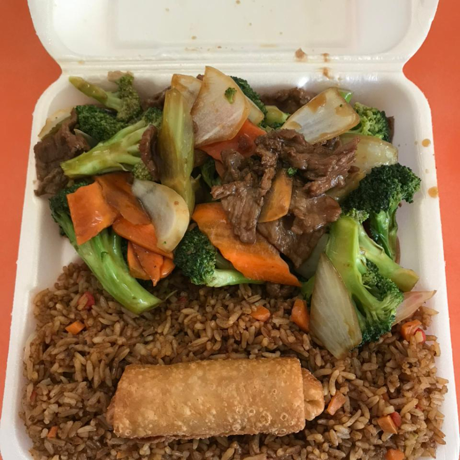 Res con brócoli (carne de res, zanahoria, brócoli con salsa secreta de la casa), arroz cantonés (arroz blanco, pollo, carne de cerdo, mortadela especial agua, proteína de soya), chun kun (rollitos de masa crujiente y frita rellenos de repollo, zanahoria y carne picada de cerdo y res).