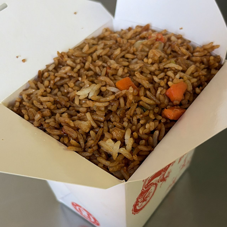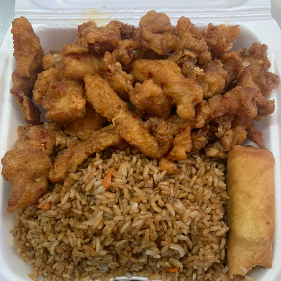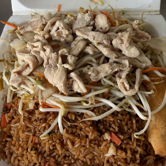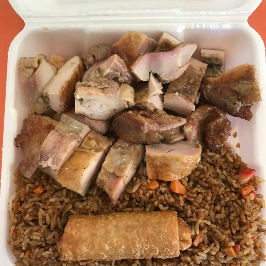 Pollo a la plancha, arroz cantonés (arroz blanco, pollo, carne de cerdo, mortadela especial agua, proteína de soya), chun kun (rollitos de masa crujiente y frita rellenos de repollo, zanahoria y carne picada de cerdo y res).