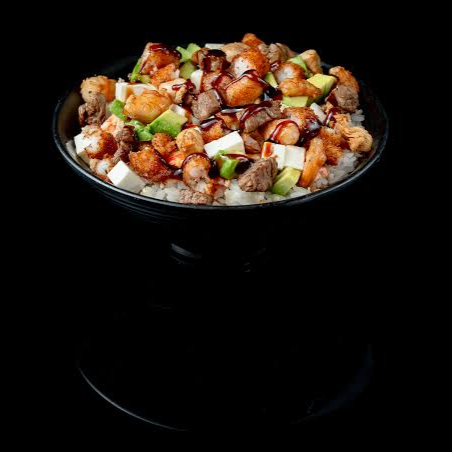 arroz frito con verduras (calabaza, zanahoria) con pollo, carne, camaron en soja por encima lleva aguacate, queso crema y ajonjolí