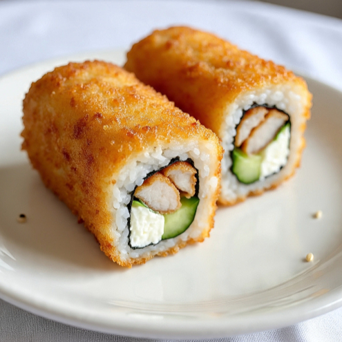 rollo sencillo relleno de pepino, queso crema, aguacate y ya sea carne, pollo o surimi empanizado opcional