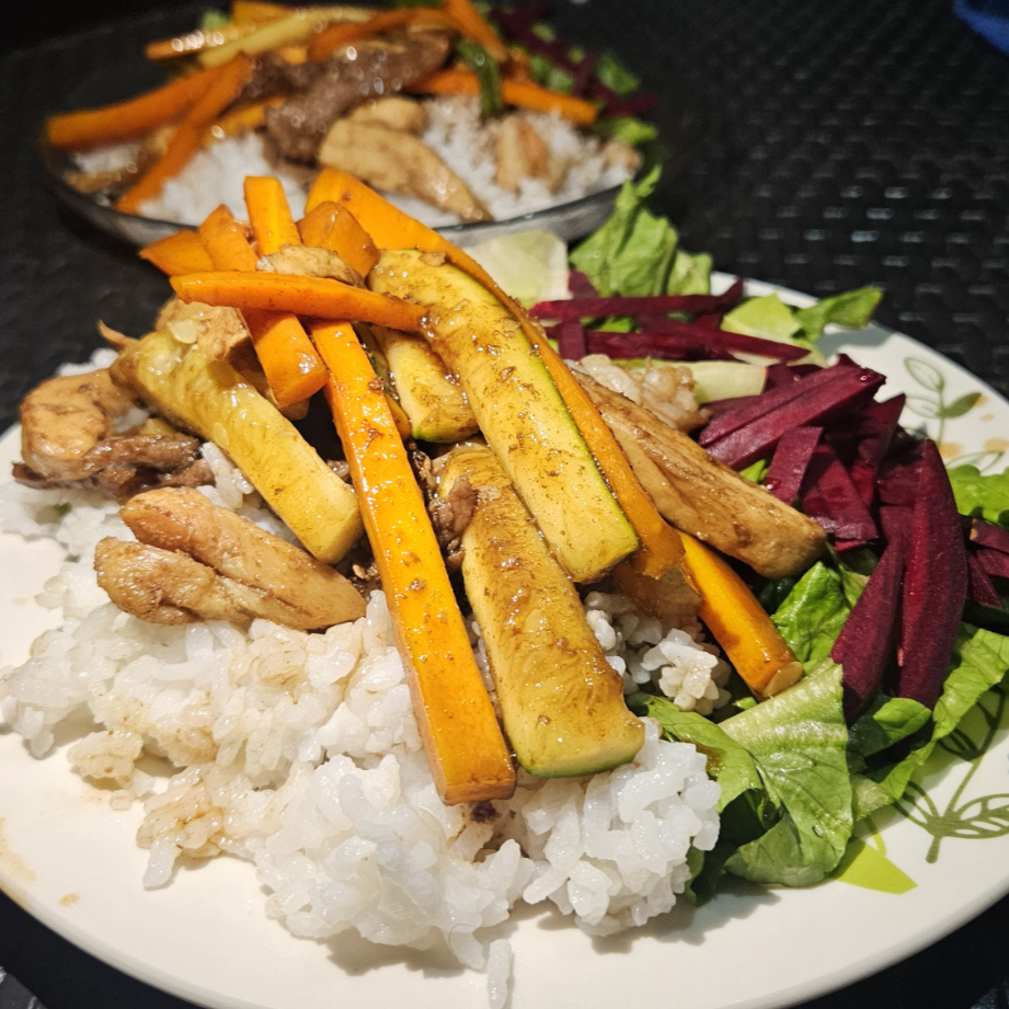 incluye ensalada de lechuga con betabel, una cama de arroz, pollo asado con verdura (calabaza, zanahoria) en salsa de teriyaki