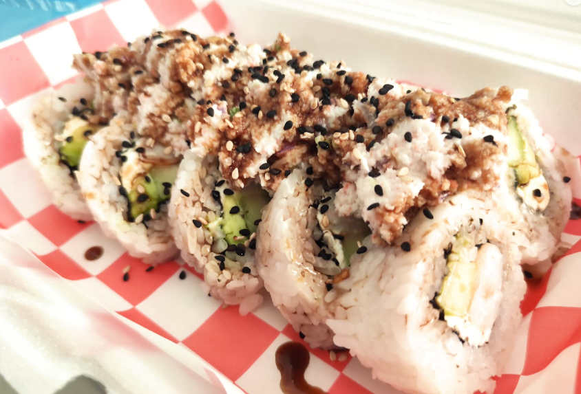 Por dentro: surimi, phila, aguacate, Philadelphia y pepino, por fuera, ajonjolí tostado. Incluye aderezo chipotle y chiles toreados en soya de la casa.
