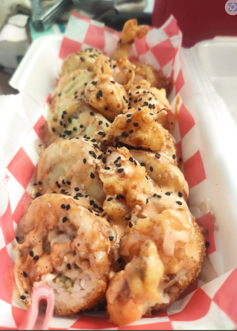 Por dentro: Camarón, Queso Gratinado, phila, aguacate. Por fuera: Topping de tampico Spicy, coronado con Camarón Roca Salsa Anguila y Sriracha. Incluye aderezo chipotle y chiles toreados en soya de la casa