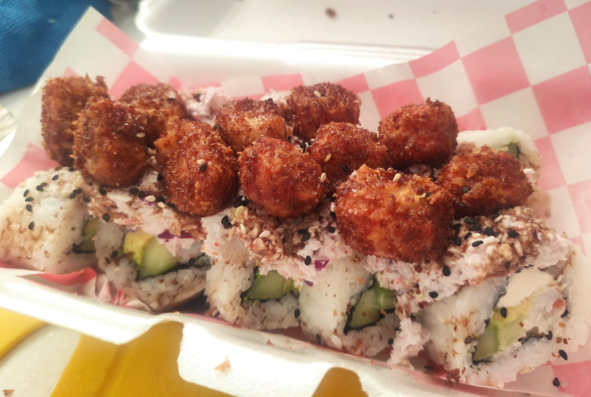 Por dentro: Cangrejo, phila, aguacate y pepino. Por fuera: Tampico, Camaron Empanizado, Con Salsa de anguila y ajonjolí tostado. Incluye aderezo chipotle y chiles toreados en soya de la casa.