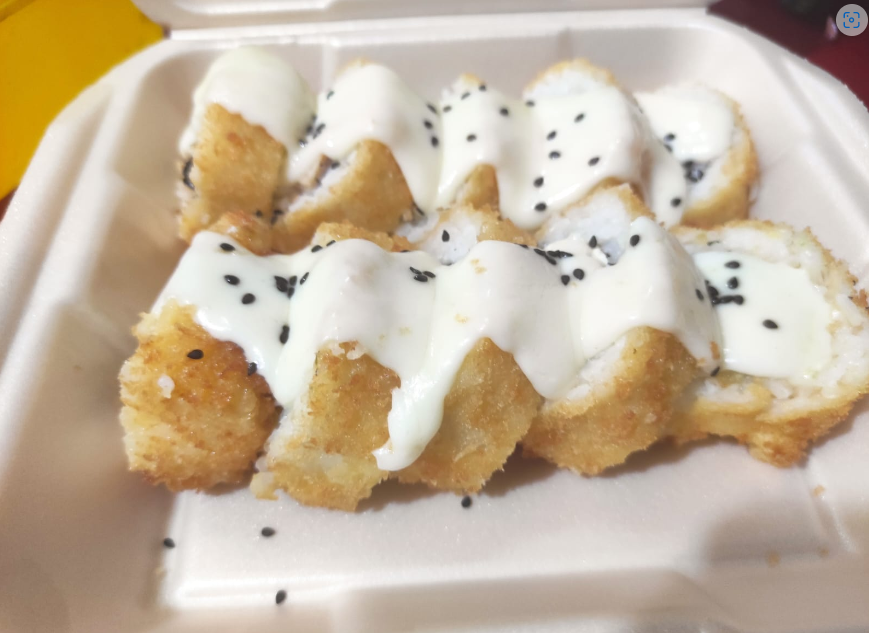 Por dentro: pollo, tocino, phila, aguacate y pepino. Por fuera: queso gratinado, y ajonjolí. Incluye aderezo chipotle y chiles toreados en soya de la casa.