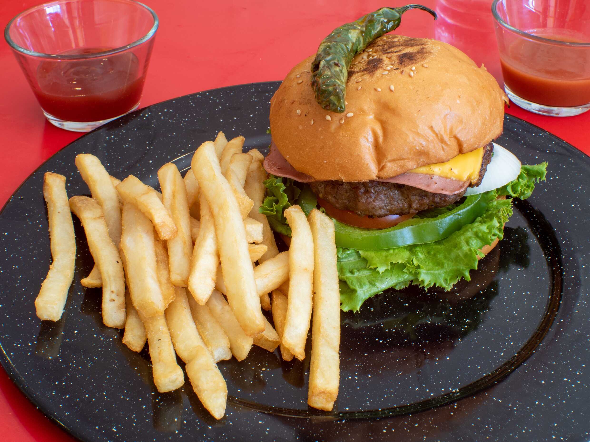 200 grms de carne de res, lechuga, jitomate, cebolla, chile morròn, pepinillos, jamòn, queso amarillo, chile toreado, aderezos, papas a la francesa.