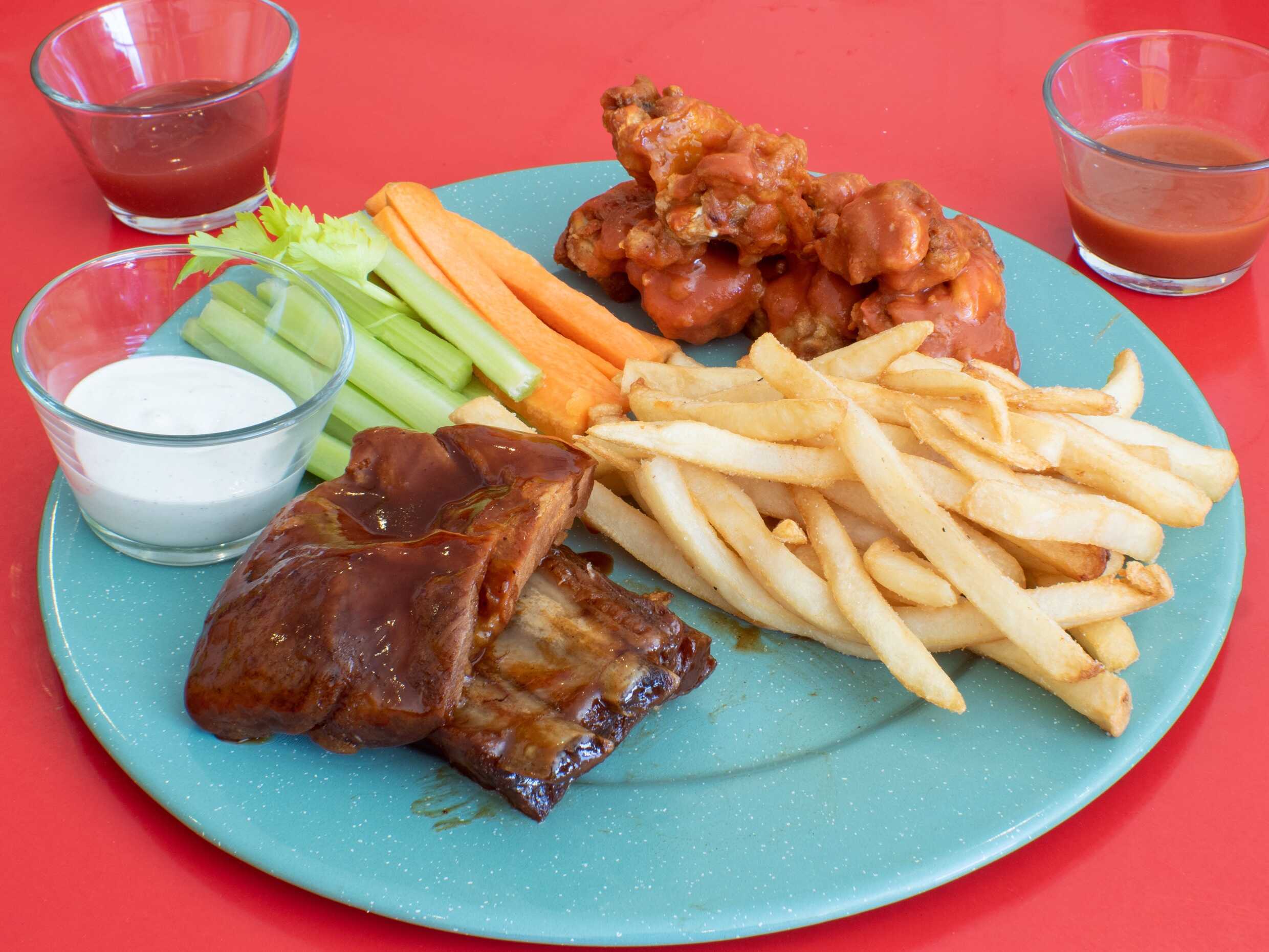 200 grms de costilla, 5 alitas, papas a la francesa, aderezos