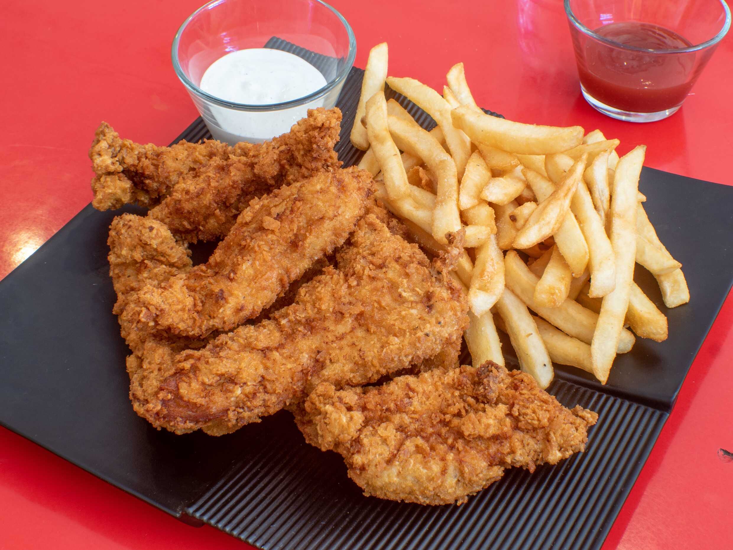 4 fajitas de pechuga de pollo con empanizado crujiente, papas a la francesa, aderezos.
