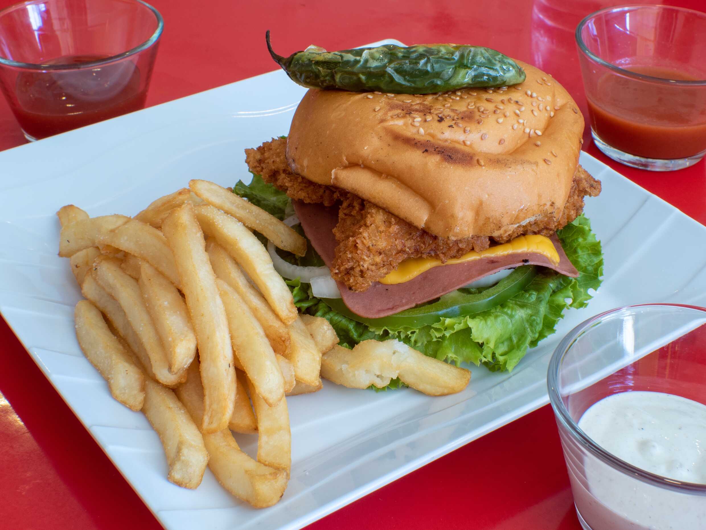 250 grms de carne de res, rellena de queso amarillo y suizo forrada en tocino, lechuga, jitomate, cebolla, chile morròn, pepinillos, chile toreado, papas a la francesa, aderezos.