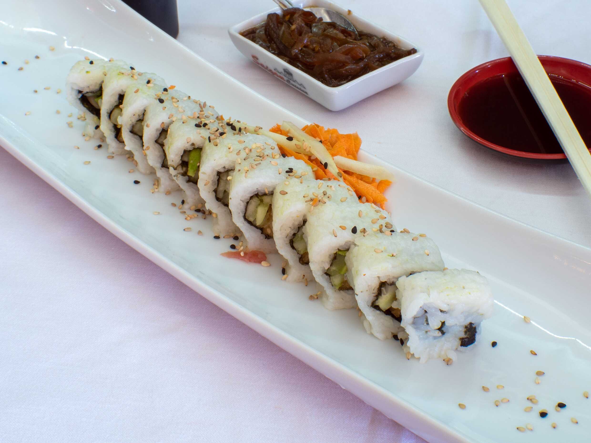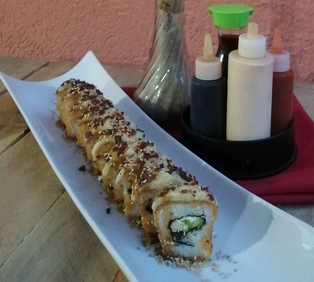 Por dentro camarón y queso crema, por fuera alga nori, tampico y salsa de anguila.