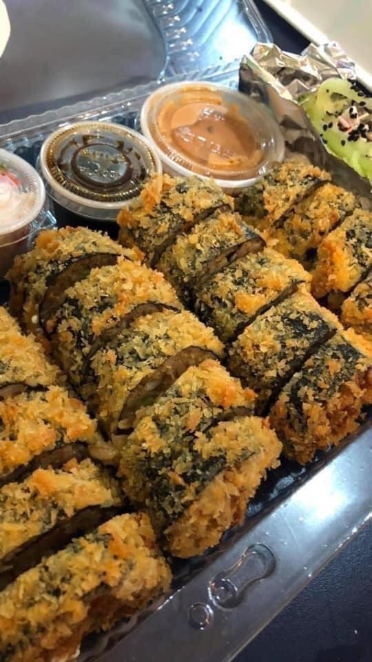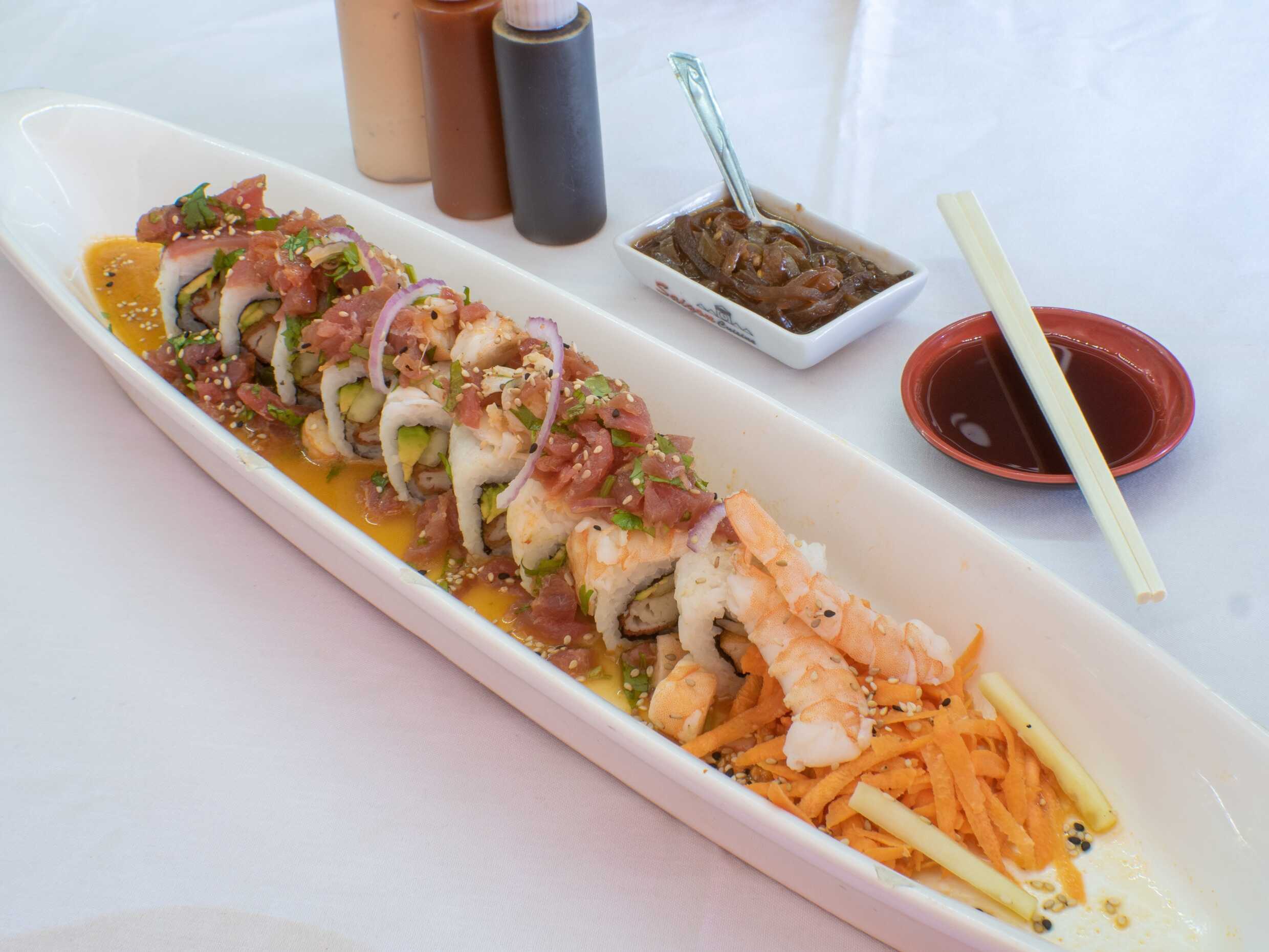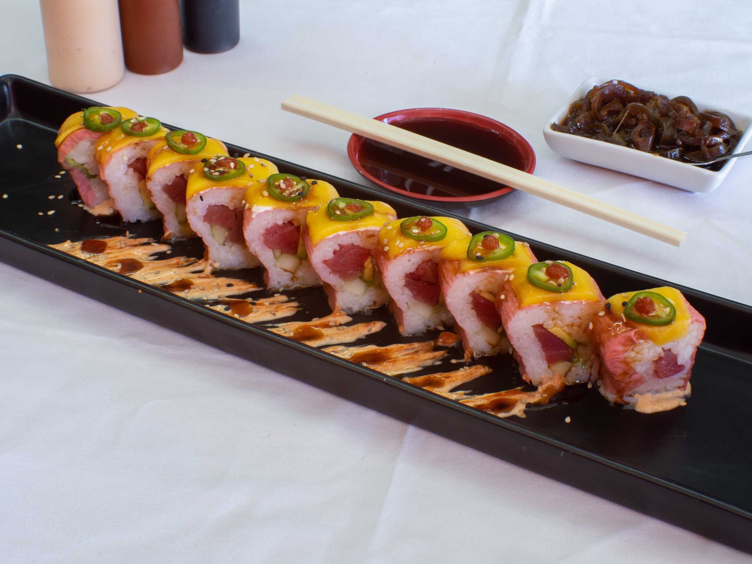Por dentro camarón, cangrejo y queso crema, por fuera atún spicy.