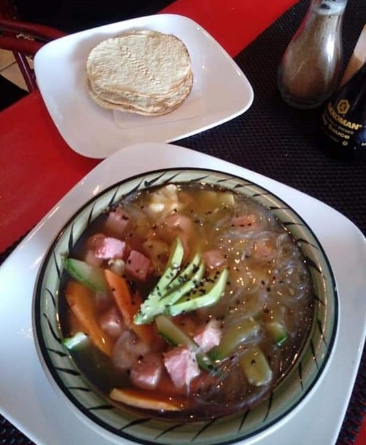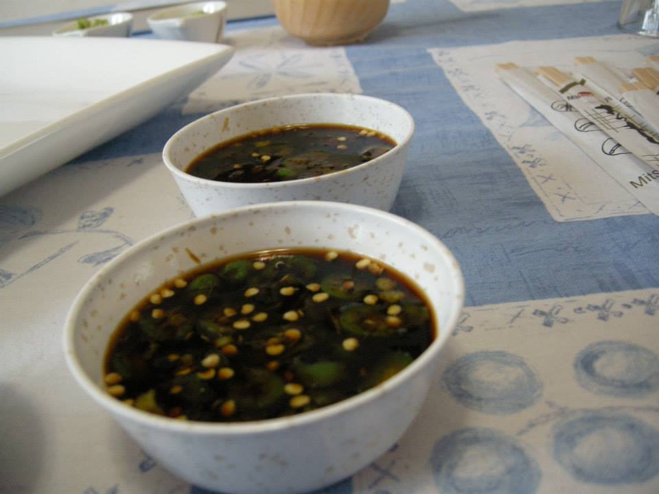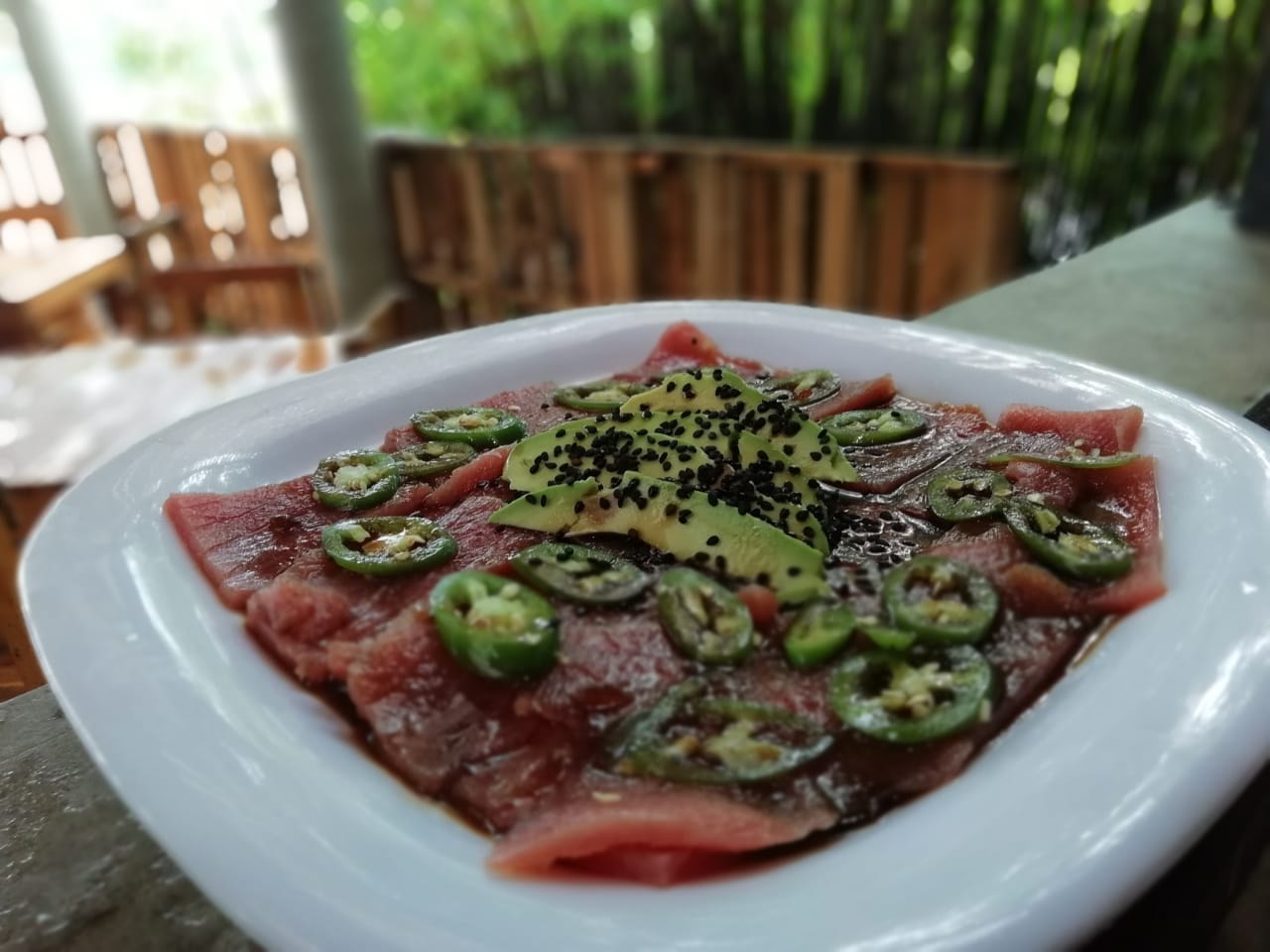 Cortes finos de atún con aguacate y chiles serranos, bañado en salsa serranito.