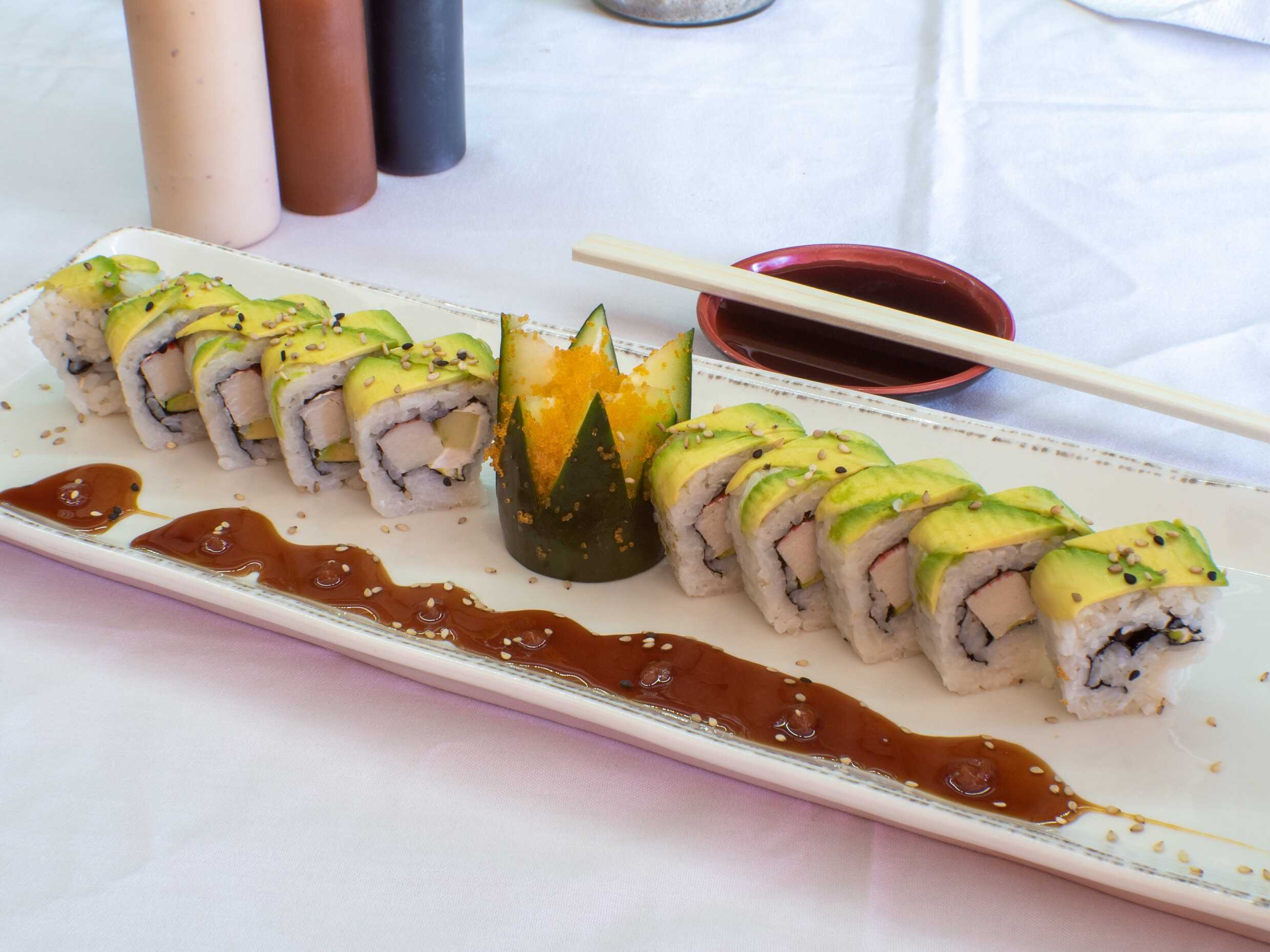 Por dentro queso crema y surimi, por fuera forrado de aguacate y salsa de anguila.